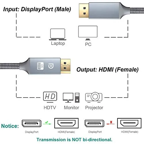 - Dies ist ein unidirektionales DP-zu-HDMI-Kabel. Es wird kein HDMI-zu-DP-Kabel unterstützt. Es ist nicht bidirektional.