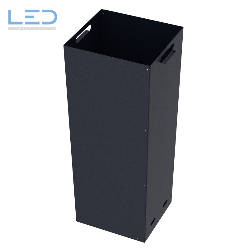 Der Behhälter ist aus Alluminium, damit er leicht und einfach zu handeln ist. Die schwarze Pulverbeshichtung ist ein Struckturlack, somit bleibt die Tüte nicht kleben. Schwarz entzieht das licht, so dass man den Abfall nicht sieht im Inenraum. Die Pulverbeschichtung ist beständig gegen Reinigungsmittel und lässt Ihren Behälter lange schön aussehen. 2mm Alu Blech machen den Behälter stabil.