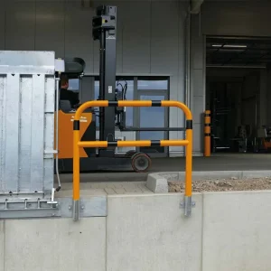 Der Absperrpfosten Ø 152 mm, neigbar, gelb-schwarz dient als anfahrsicheres Sperrelement für Verladerampen, Hallen- und Gebäudeecken und ähnliche Gefahrenstellen im Betrieb. Der Pfosten ist mit dem RAL-Farbton 1003 in Gelb (Abbildung ähnlich) beschichtet und mit schwarzen Streifen versehen.