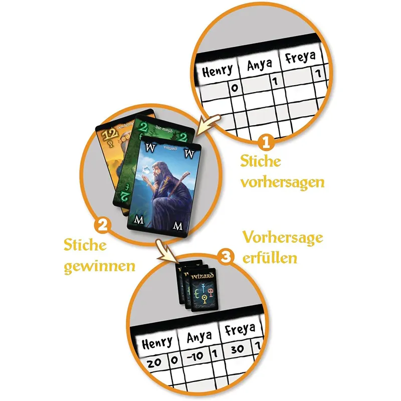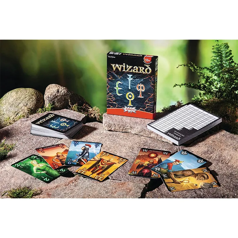 Die Karten mit Symbolen und stimmungsvollen Zeichnungen versetzen die Spieler zurück in die Zeit von Zauberlehrlingen in Stonehenge. Vier Spielvarianten lassen Wizard auch für wahre Meister der Vorhersehung nie langweilig werden.