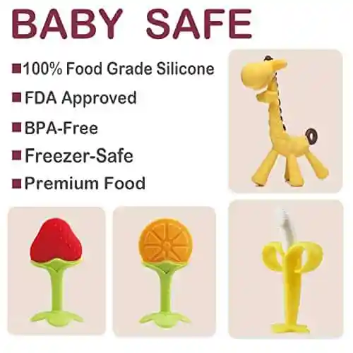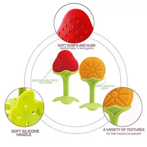 Der Griff ist genau richtig, damit das Baby ihn halten kann, und die Grösse ist gut, damit es kauen kann. Es passt sich dem Mund des Babys bequem an, ohne dass eine Erstickungsgefahr besteht. Baby liebt die hellen Farben und die fruchtigen Formen. Es ist eine grosartige Möglichkeit, sie zu beschäftigen und zu unterhalten und gleichzeitig Erleichterung beim Zahnen zu haben. Sowohl Jungen als auch Mädchen werden es mögen.