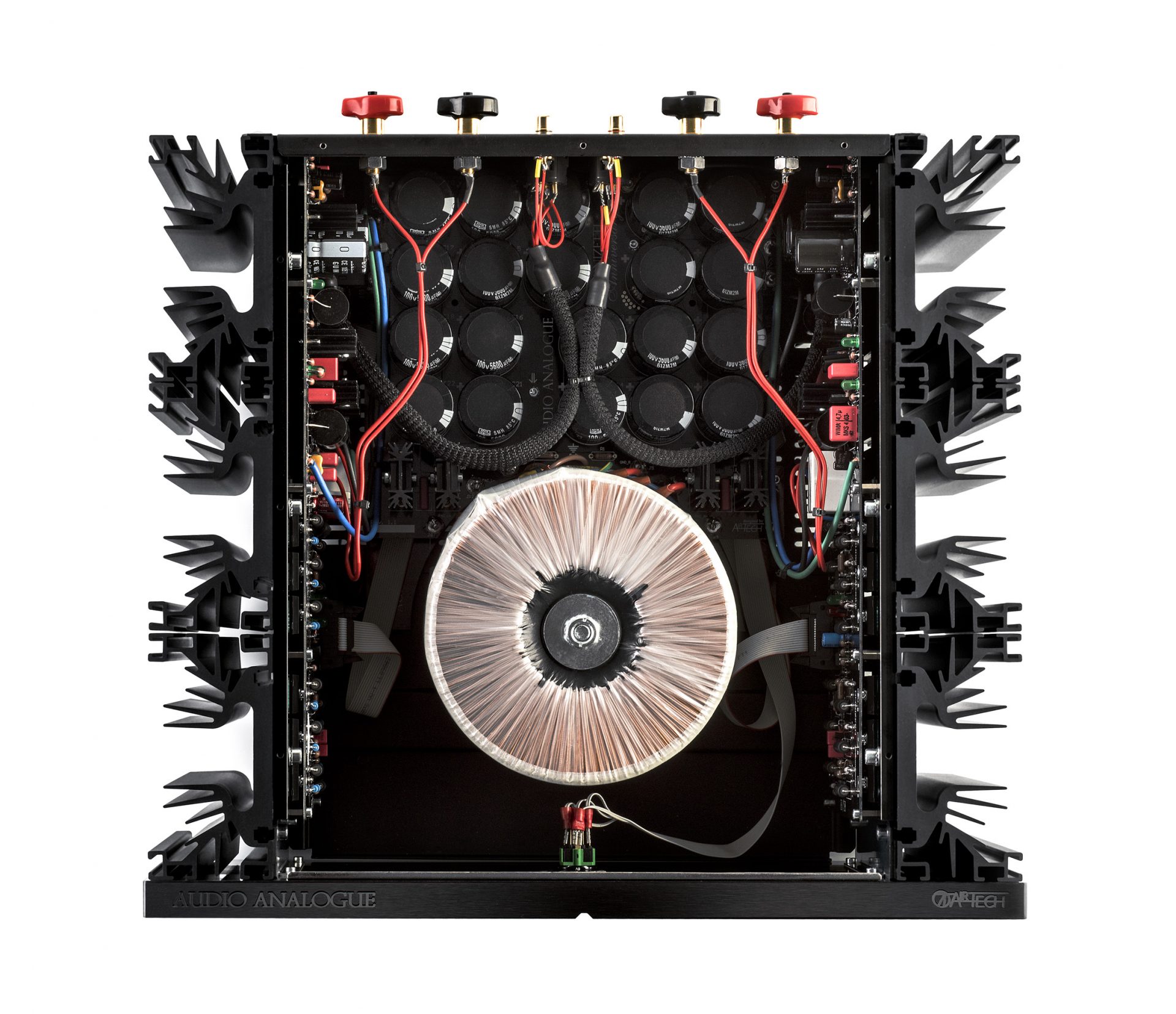 Zero Global Feedback (Rückkopplung), alle Stufen vollständig symmetrisch, Dual-Mono-Konfiguration und diskrete Komponentenschaltungen, Leistungsstufe mit 12 Bipolartransistoren pro Kanal, 56000 μF Filterkapazität pro Kanal, übergroße Militärwiderstände zur Minimierung thermischer Verzerrungen, „audiograde“ Kondensatoren gemäß Airtech-Spezifikationen, Mikrocontroller Verwaltung.