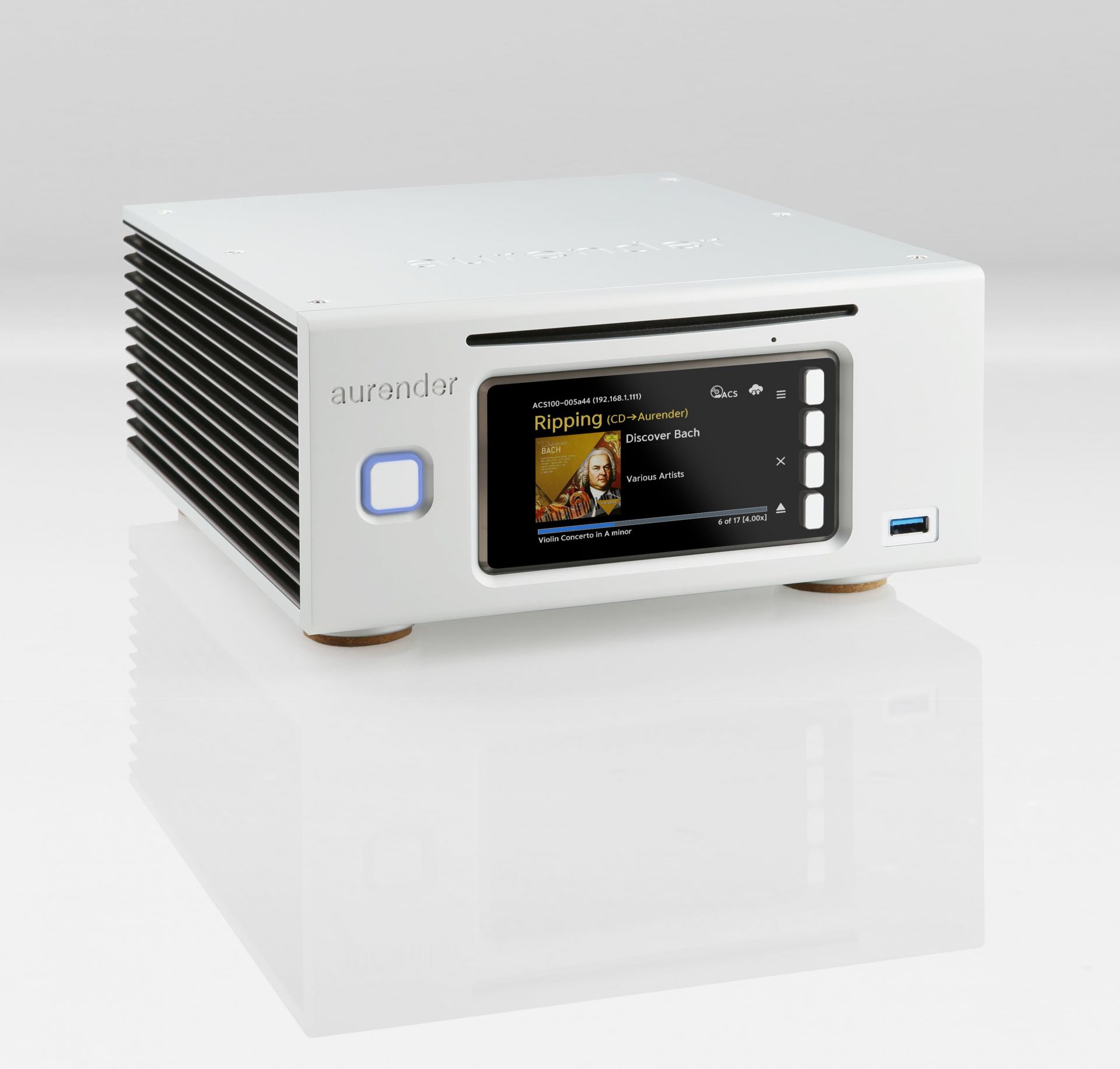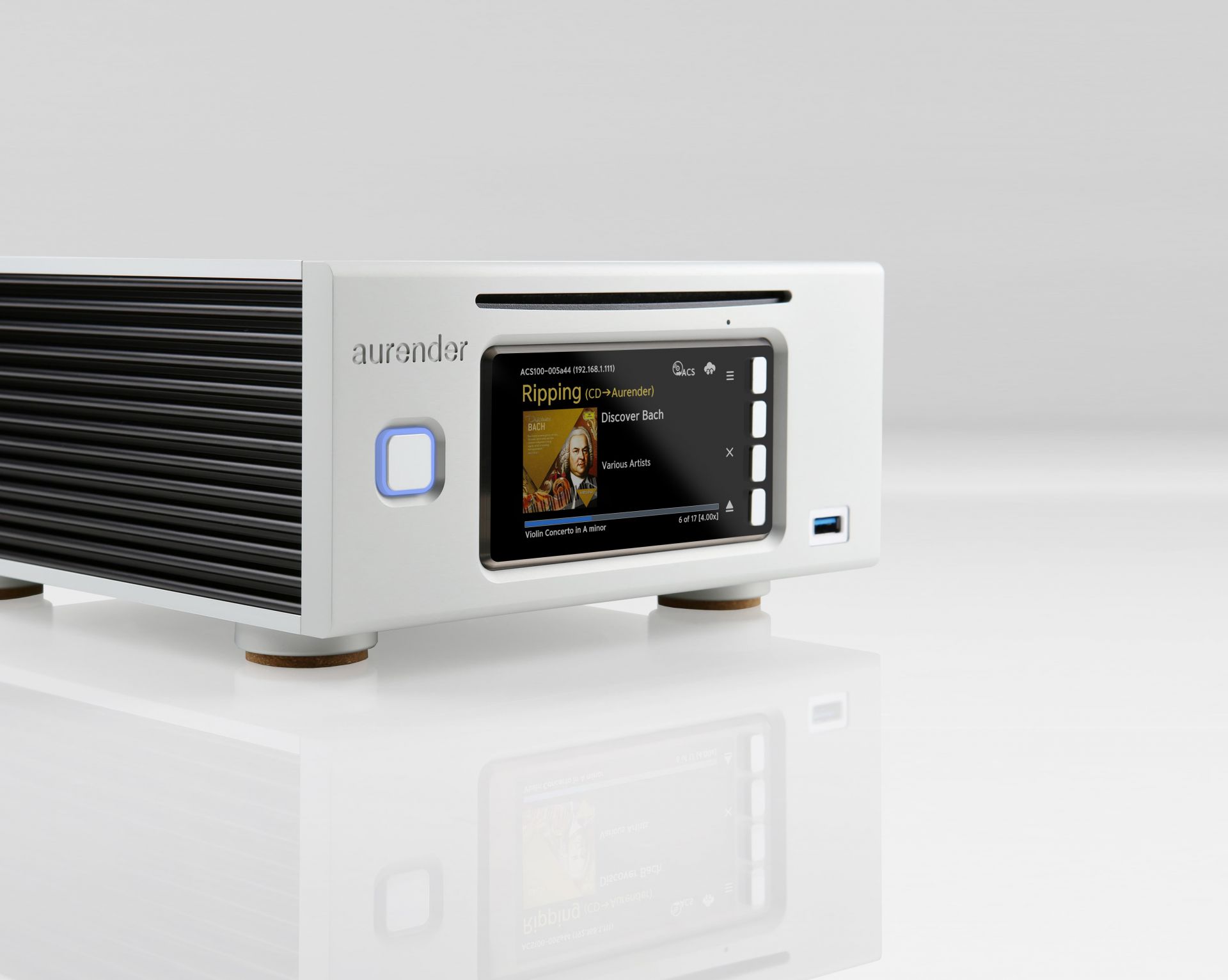 Die CD-Ripping-Engine von Aurender erstellt die am besten klingenden Dateien in den FLAC-, WAV- oder AIFF-Codecs Ihrer Wahl. Metadaten werden automatisch abgerufen und das Albumcover und andere Metadaten können auf dem Frontblende-Display angezeigt werden. Ein TEAC-CD-ROM-Laufwerk extrahiert die CD-Daten in einem One-Touch-Vorgang bitgenau und legt die Datei zur sofortigen Wiedergabe in einem vom Benutzer festgelegten Ordner ab.