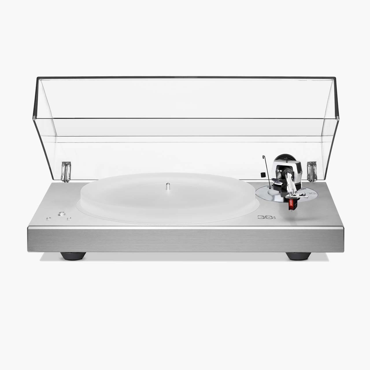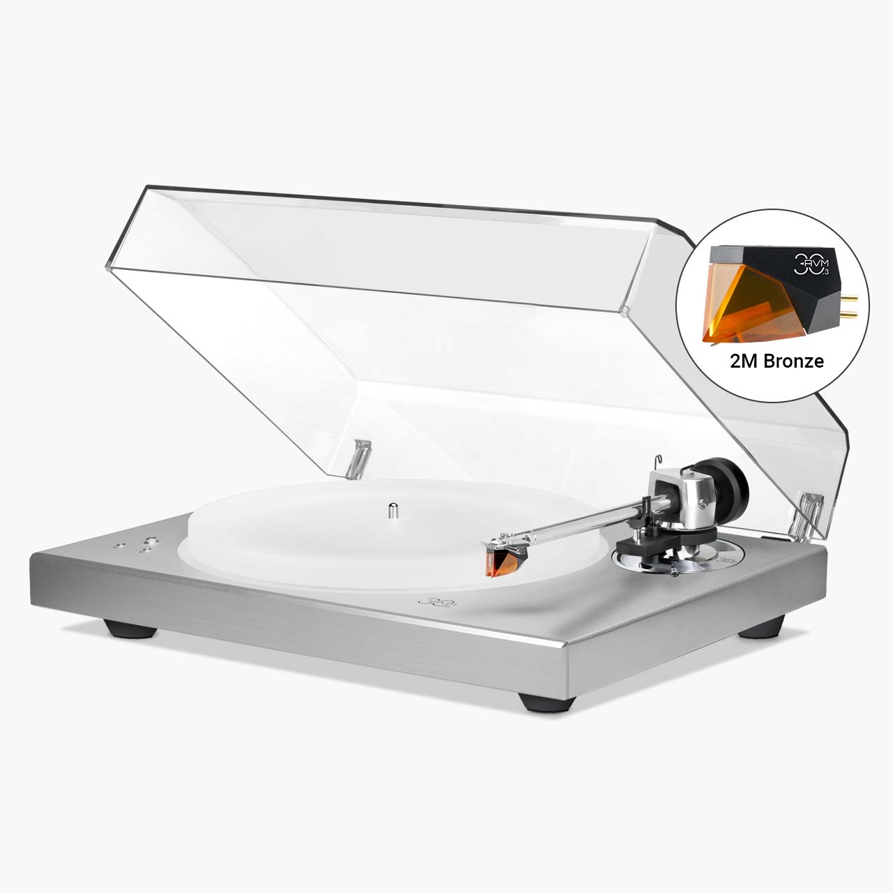 Plattenspieler mit Einzelmotor-Riemenantrieb · 9-Zoll-AVM-Tonarm mit Kardanring · Massiver 35-mm-HDF-Verbundrahmen, lackiert und verstärkt mit polierter Aluminiumfront (baugleich mit dem R 2.3) · Im Boden versenkter Plattenspieler auf vier höhenverstellbaren Dämpferfüßen · Weiße Plattenspielerbeleuchtung (dimmbar und schaltbar) · Klappbare Acrylabdeckung · 33/45 U/min mit nach vorne gerichteter Servosteuerung.