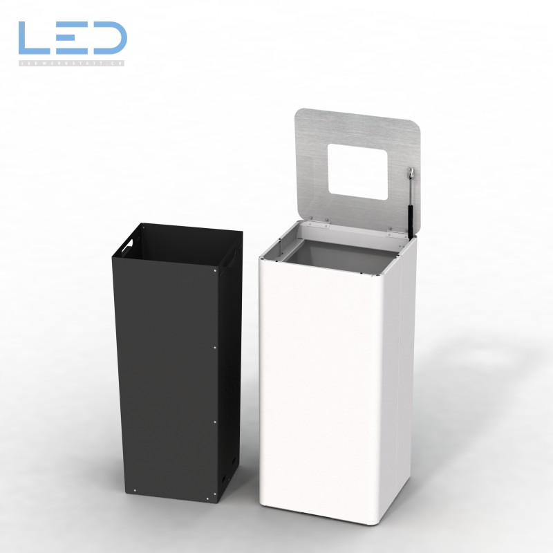 Wie bei allen Produkte achten wir auch bei der B-IN-Serie auf nachhaltige Materialien und Swiss Made. So wird das Gehäuse und die Innenteile aus bis zu 70% Alt-Aluminium und VOC freier Pulverbeschichtung (volatile organic compounds, VOC) hergestellt. Die Signete werden als Folien-Schnitt aufgeklebt. Der Deckel und das Scharnier werden aus Edelstahl 1.4301 umgesetzt. So ist eine Korrosion auch nach vielen Jahren sehr unwahrscheinlich.