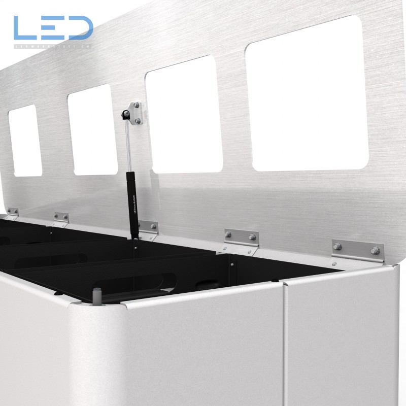 Wie bei allen Produkte achten wir auch bei der B-IN-Serie auf nachhaltige Materialien und Swiss Made. So wird das Gehäuse und die Innenteile aus bis zu 70% Alt-Aluminium und VOC freier Pulverbeschichtung (volatile organic compounds, VOC) hergestellt. Die Signete werden als Folien-Schnitt aufgeklebt. Der Deckel und das Scharnier werden aus Edelstahl 1.4301 umgesetzt. So ist eine Korrosion auch nach vielen Jahren sehr unwahrscheinlich.