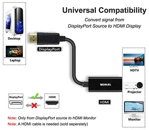 • Der Benfei DisplayPort-zu-HDMI-Adapter bietet eine kostengünstige und einfache Lösung zum Anschliessen eines Desktops, Laptops oder anderer Geräte mit DisplayPort-Anschluss an ein HDMI-Display wie Monitor, Projektor oder Fernseher. Schliessen Sie das männliche DisplayPort-Ende des Konverters an den DisplayPort-Anschluss Ihres DisplayPort-Geräts an und verbinden Sie das HDMI-Buchsenende vom Display aus mit Ihrem HDMI-Kabel.