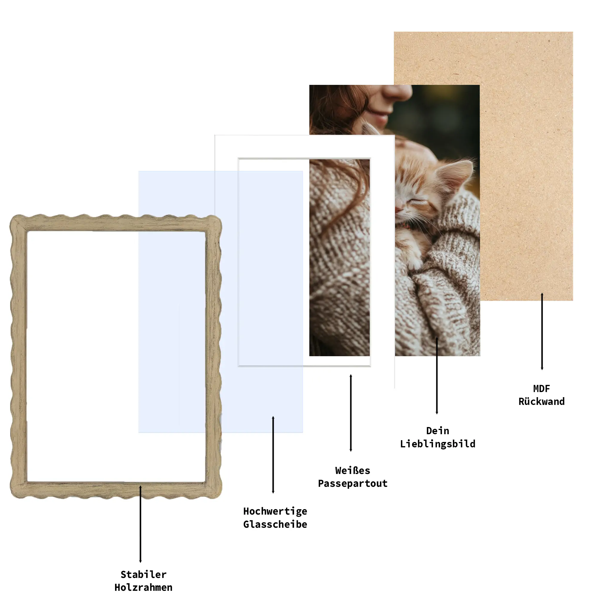 Hochwertiger Holzrahmen in Hellbraun mit wellenförmigem Rand und Passepartout für einen edlen Look.
