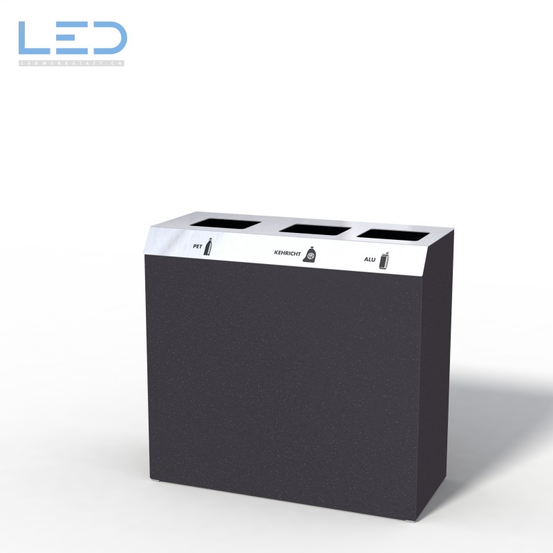 Farblich wird die C3-Bin Recyclingstation in DB703 (Dunkelgrau mit Eisenglimmer) und einem Edelstahl-Einwurfdeckel mit schwarzen Signeten angeboten. Andere RAL Farben wählen Sie im Konfigurator.