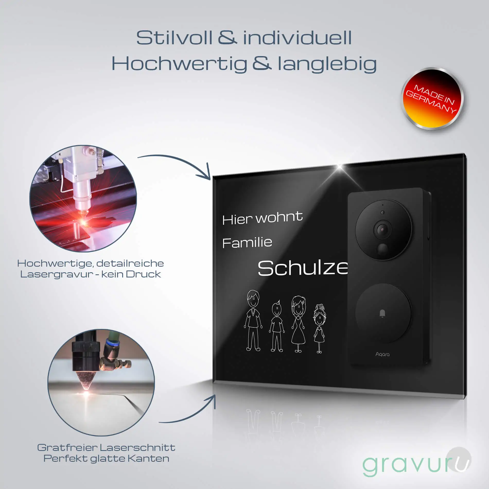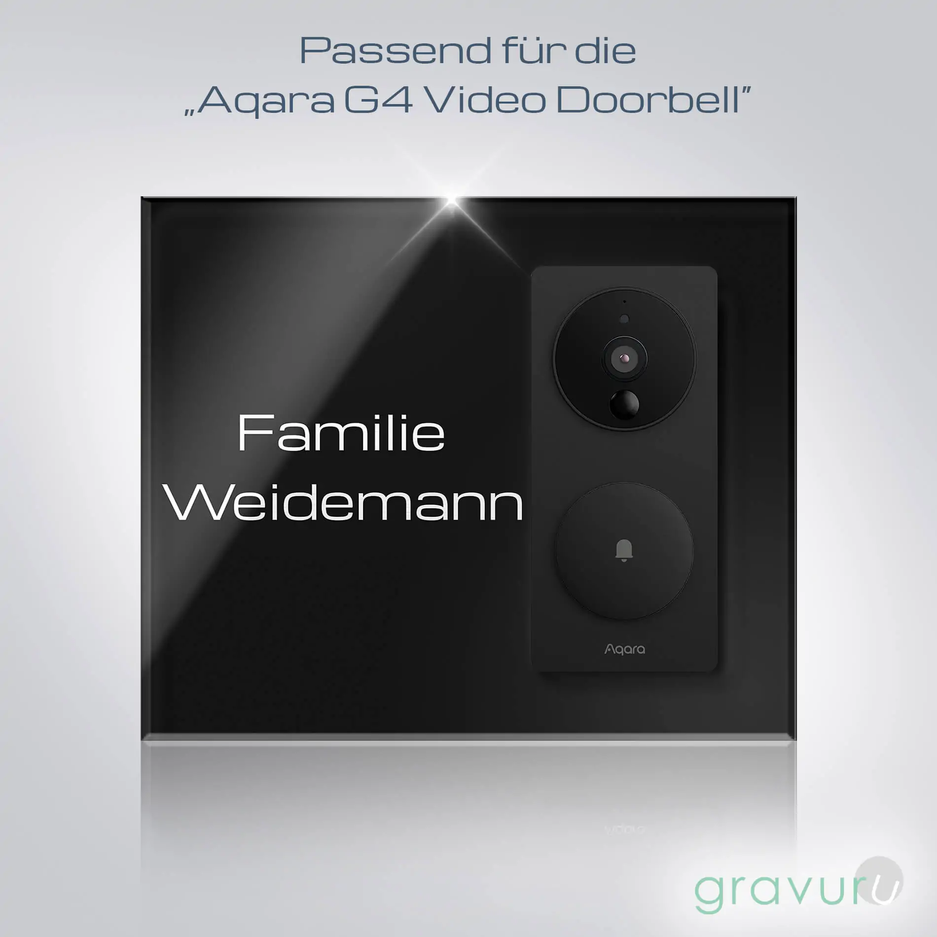 Das Funkklingelschild wird mit einer Aussparung im Acrylglas für Deine Aqara Videoklingel gefertigt. Die Edelstahlhintergrundplatte weist keinen Ausschnitt auf. So kann die Videotürklingel einfach in den Ausschnitt auf die Edelstahlplatte geklebt werden. Das Klingelschild selbst kannst Du optional mit Silikon, zusätzlichen Bolzen oder Klebeband für glatte Oberflächen montieren. Sollte keine Auswahl erfolgen, wird die Platte ohne Befestigung geliefert!