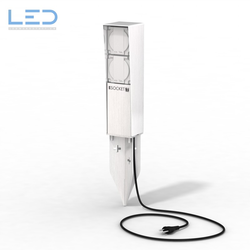 Modularer Steckdosensockel mit Erdspiess ESOCKET 350-F in geschliffenem Edelstahl (INOX) mit Feller NEVO NAP Apparaten für Ihren Aussenbereich. Ein echter Blickfang in jedem Garten.