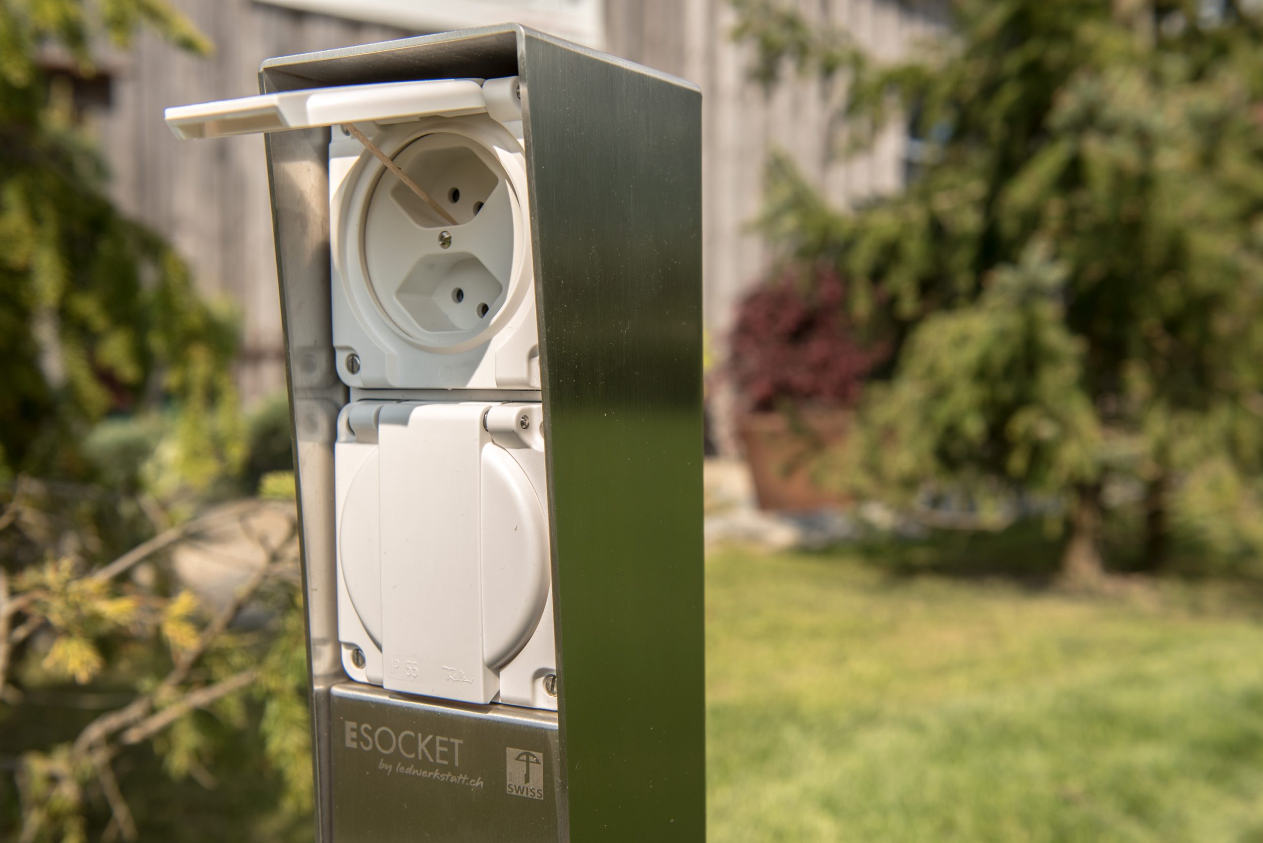 Als Material haben wir uns für eine Ausführung in robusten und geschliffenen 2,5 mm Edelstahl entschieden. Damit bleibt die Anschlusssäule ESOCKET 350-F auch bei Lackschäden korrosionsbeständig. Die versteckten Befestigungsschrauben sind witterungsgeschützt und die IP21 / IP55 Steckdosen/Schalter von Feller NEVO können beliebig getauscht werden.