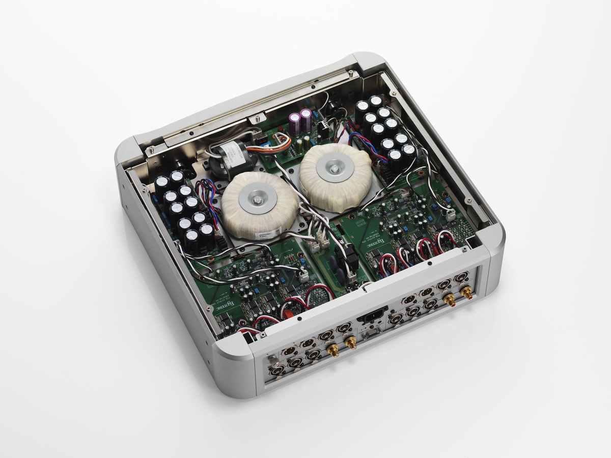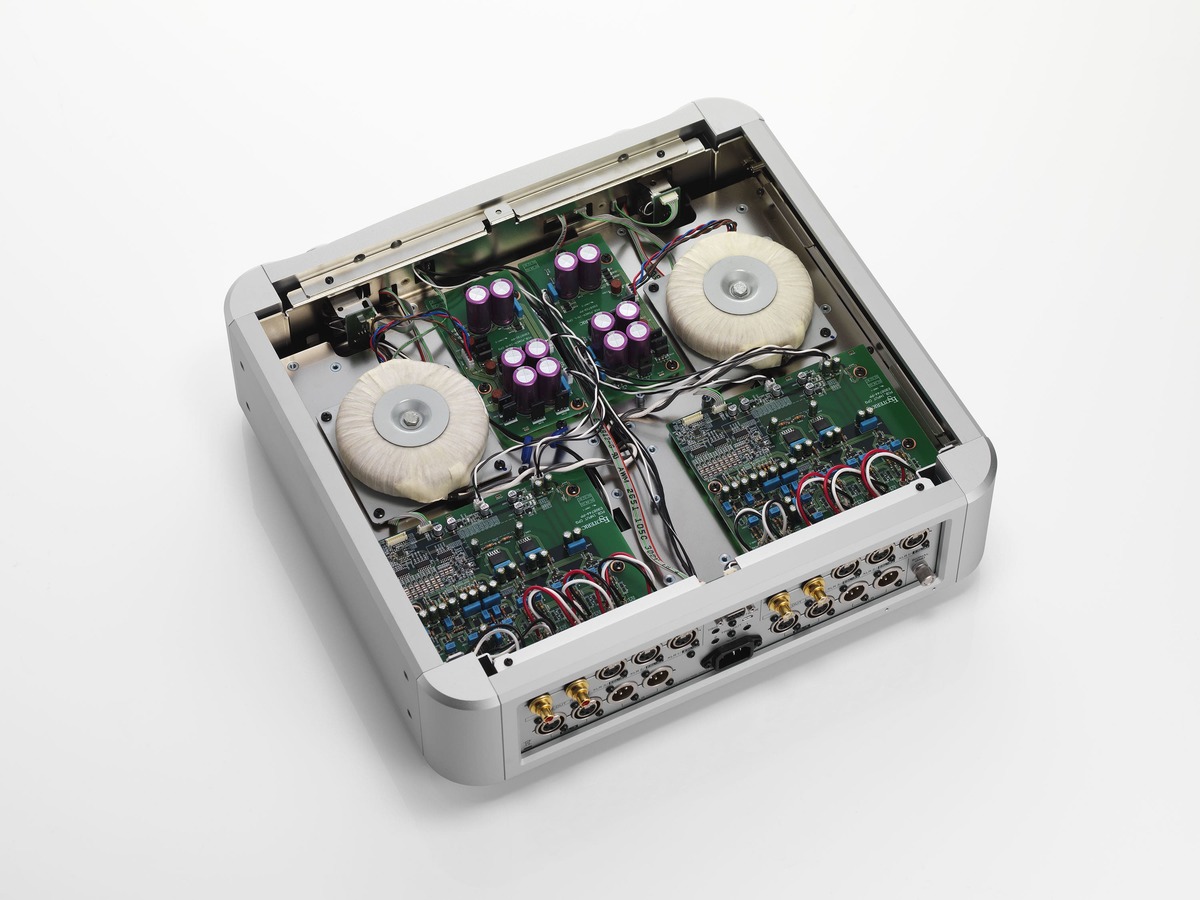 Durch die Trennung der Stromversorgungskomponenten für jede Sektion und die Investition von weit mehr Material als eigentlich erforderlich, werden gegenseitige Störungen zwischen den Schaltkreisen grundsätzlich ausgeschlossen, was zu einer extrem reinen und dynamischen Klangqualität führt. Darüber hinaus werden sorgfältig ausgewählte, für ein Spitzenmodell geeignete Bauteile wie die hochkapazitiven Grandioso-Blockkondensatoren und Schottky-Barrieredioden verwendet, um eine hohe Klangqualität zu erreichen.
