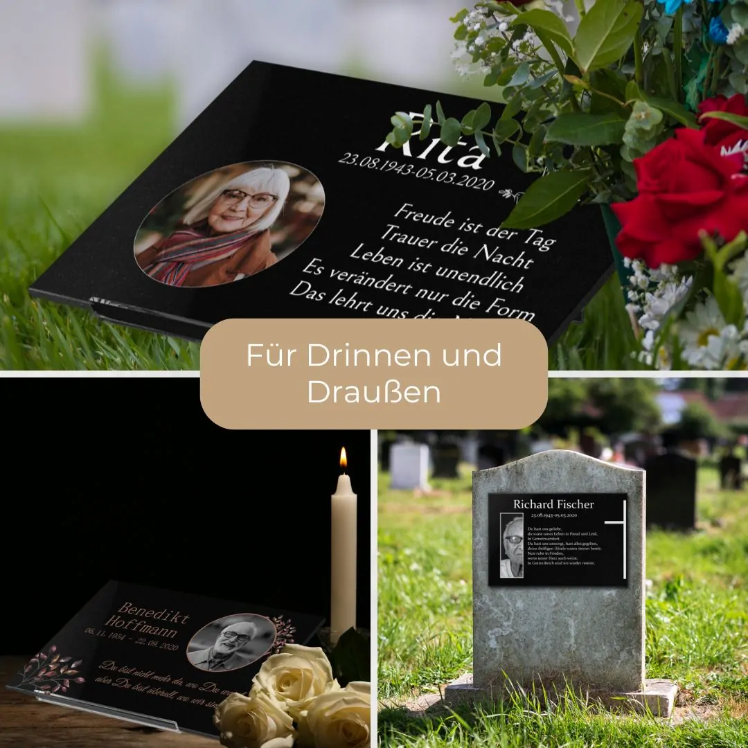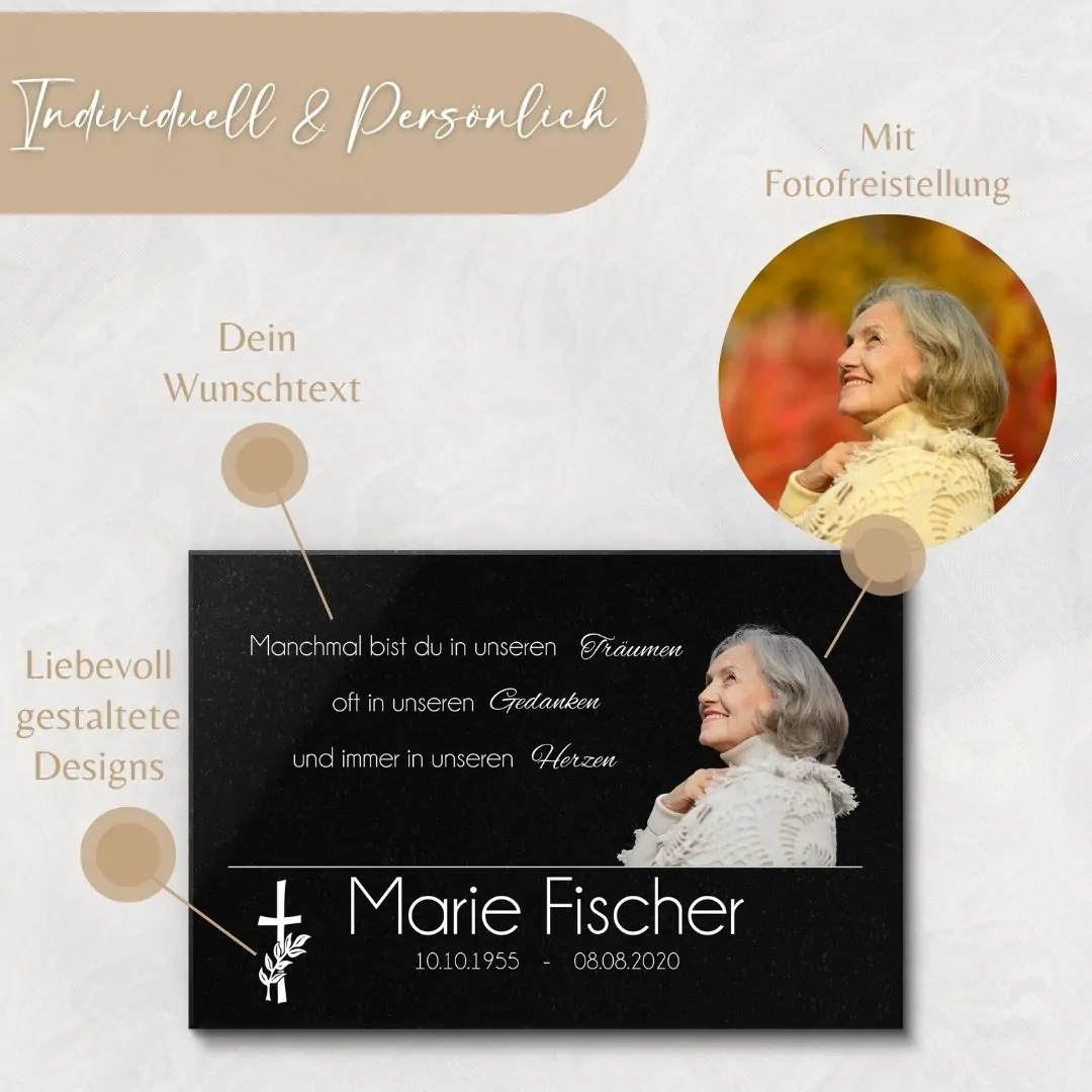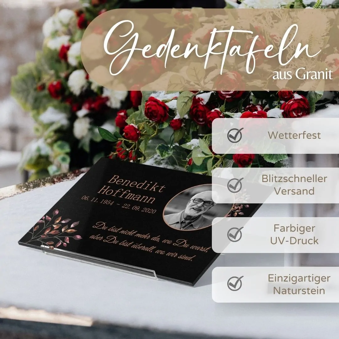 Bewahre die Erinnerung an einen geliebten Menschen mit unserer hochwertigen Granit-Gedenktafel, die durch farbigen UV-Druck zum Leben erweckt wird. Die aufwendig polierte Oberfläche des Granits spiegelt die Tiefe und die Bedeutung des Andenkens wider, während der lebendige Farbdruck die Persönlichkeit des Verstorbenen einfängt und ehrt.
