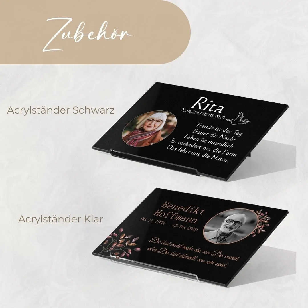 Im Konfigurator kannst Du die Gedenktafel ganz individuell selbst gestalten. Hierzu kannst Du deinen eigenen Wunschtext, z.B. auch einen Trauerspruch oder eine persönliche Botschaft eingeben, eine passende Schriftart sowie Schriftfarbe auswählen und ein Foto einfügen. Des Weiteren steht Dir eine große Auswahl an liebevoll gestalteten Motiven zur Verfügung.