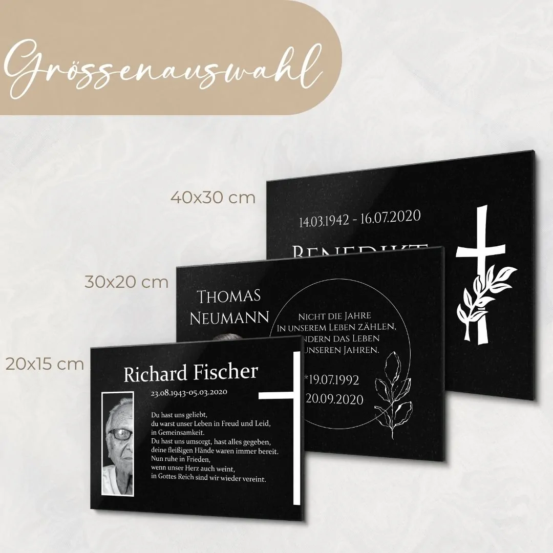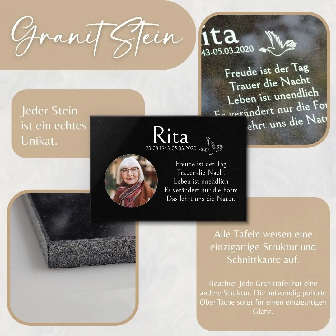 Granit, als Naturstein, macht jede unserer Grabplatten zu einem echten Unikat. Die individuelle Struktur jeder Tafel unterstreicht die Einzigartigkeit des Menschen, dem sie gewidmet ist, und bietet eine dauerhafte, edle Art, seine Geschichte und sein Andenken zu wahren. Diese Gedenktafeln sind eine würdevolle Weise, Abschied zu nehmen und zugleich eine fortwährende Verbindung zu dem geliebten Menschen zu halten.