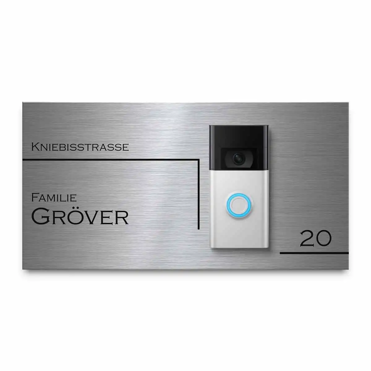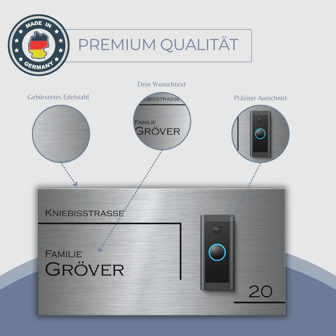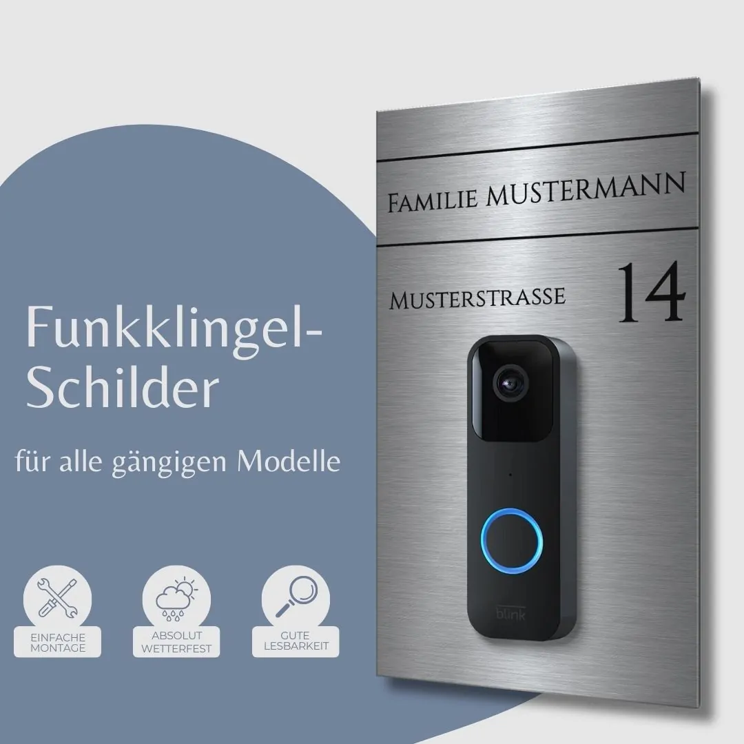 Du suchst eine stilvolle Möglichkeit um Deine Funkklingel im Hauseingang zu befestigen? Gestalte eine Klingelplatte für Deine Funkklingel und personalisiere sie genau nach Deinen Wünschen. Unsere hochwertigen Funkklingelschilder aus massivem V2A Edelstahl machen Deine Doorbell Türklingel zu einem echten Hingucker im Eingangsbereich.