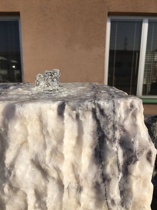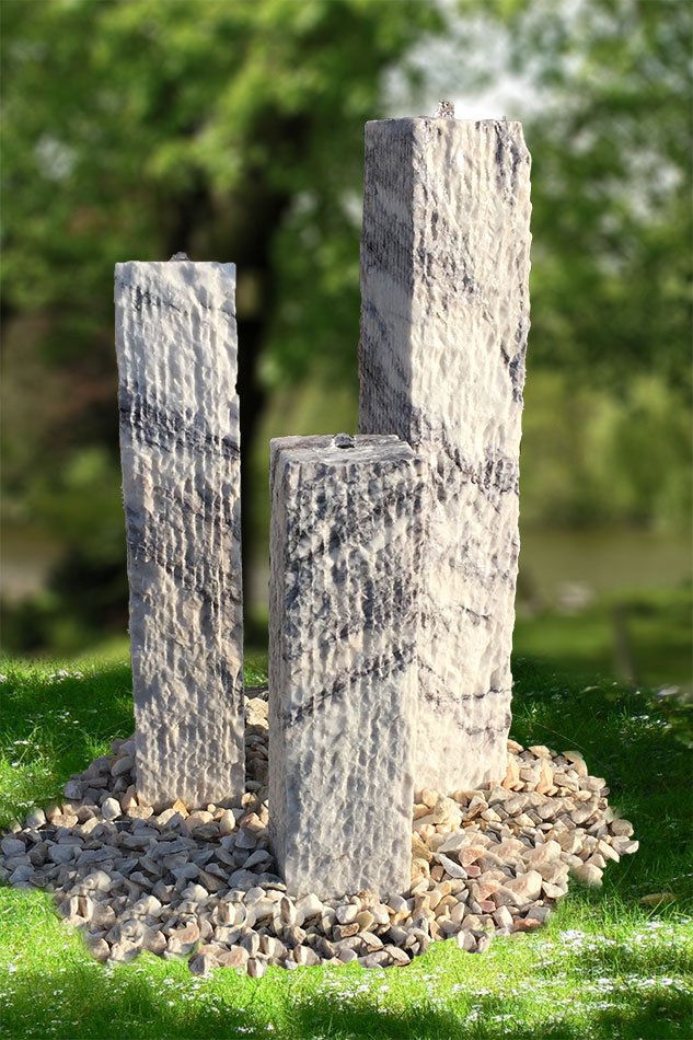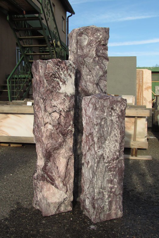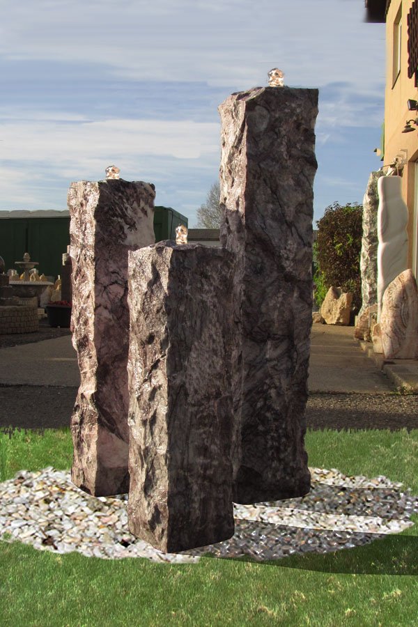 Die drei abgestuften rustikalen Naturstein-Stelen aus dem weiß/lila farbigen Marmor “Purple Wave” bilden eine schöne Gruppe, die Ruhe und Stärke ausstrahlt. Die felsigen Stelen vereinen modernes Design mit rustikalem Stil.