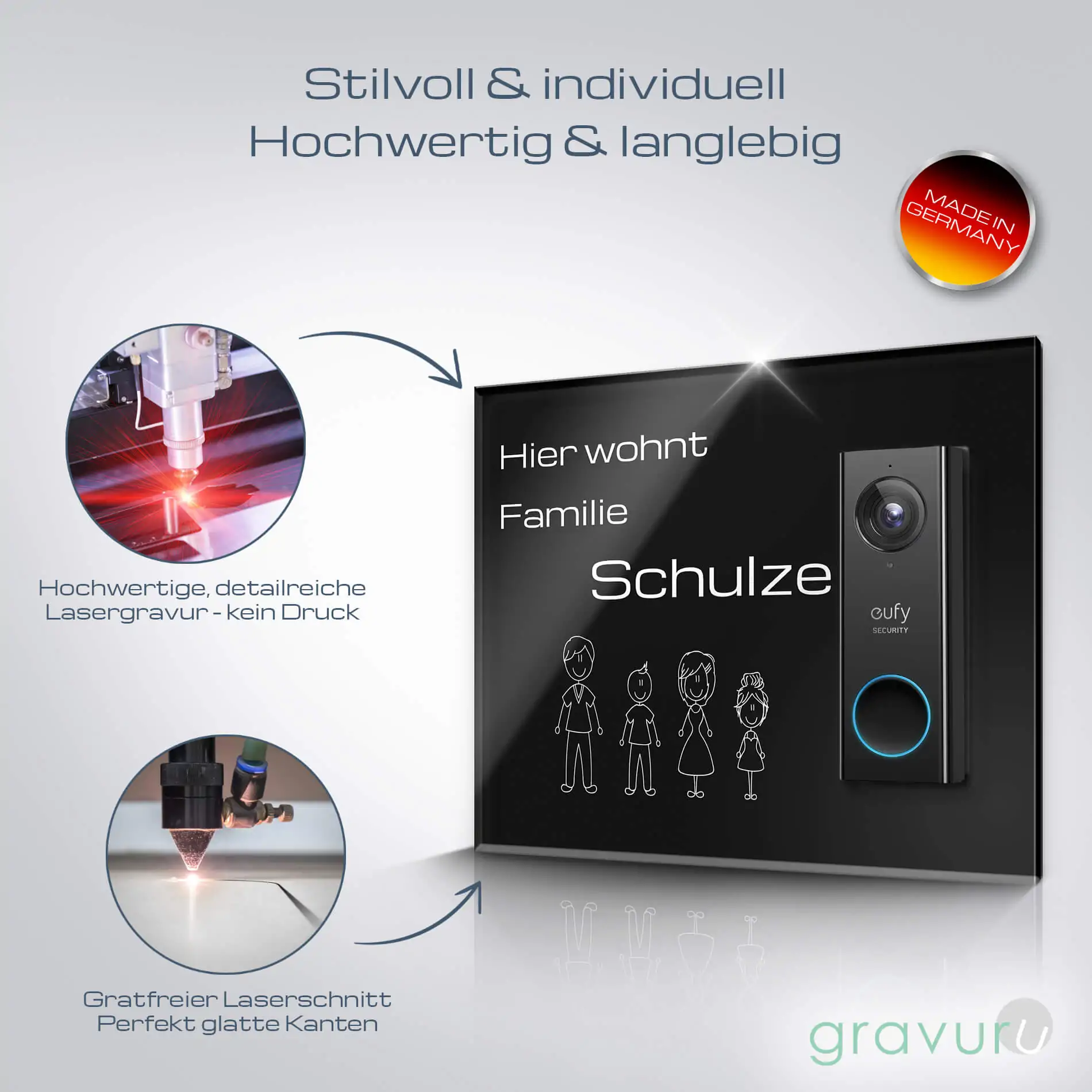 Die Funkklingelschilder aus Edelstahl & Acrylglas werden in unserer hauseigenen Produktionsstätte nach Industriestandard lasergeschnitten und graviert. Die Klingelplatte besticht nicht nur mit ihrer Optik, sondern auch mit ihrer Witterungsbeständigkeit – sie ist beständig, rostet nicht und trotzt Wind und Wetter.