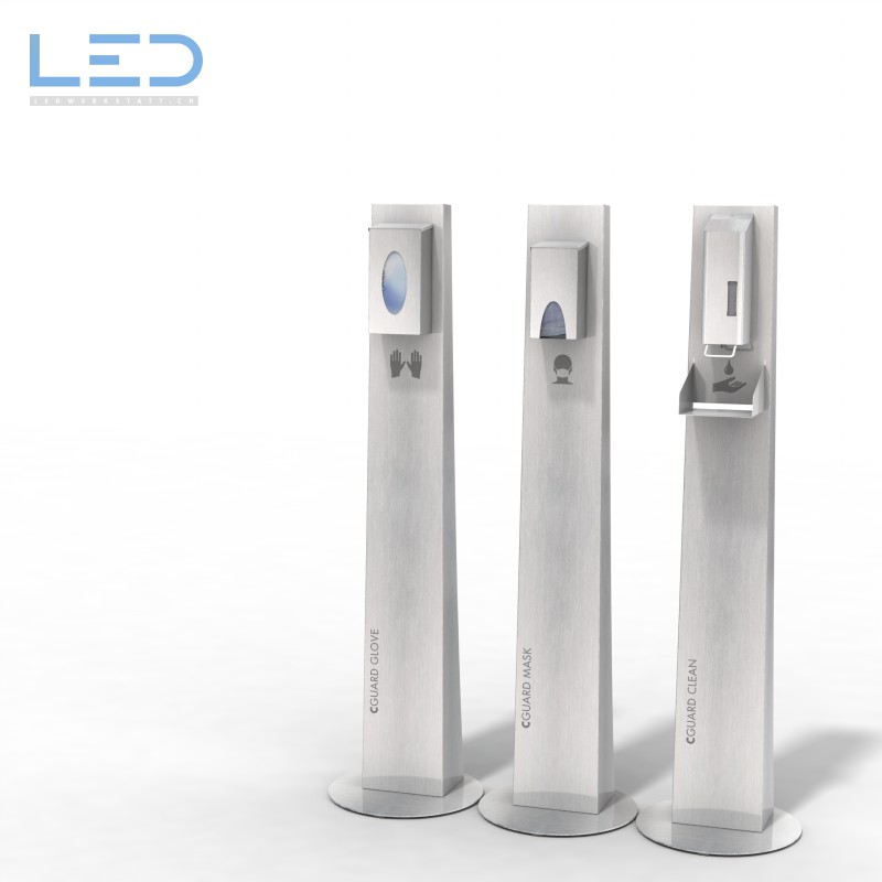 Daher bieten wir mit unserem Hygienespender C-Guard professionelle Spender für Schutzmaterial und Hand-Desinfektion an. Freistehende Hygienesäulen sind im Eingangsbereich gut sichtbar, damit Ihre Kunden und Mitarbeiter beim Betreten der Liegenschaft kontinuierlich an die Hygienemassnahmen erinnert werden. Hängen die Spender an der Wand, so finden Sie kaum Beachtung.