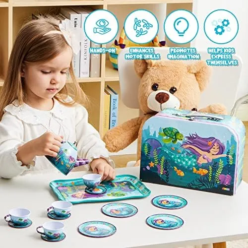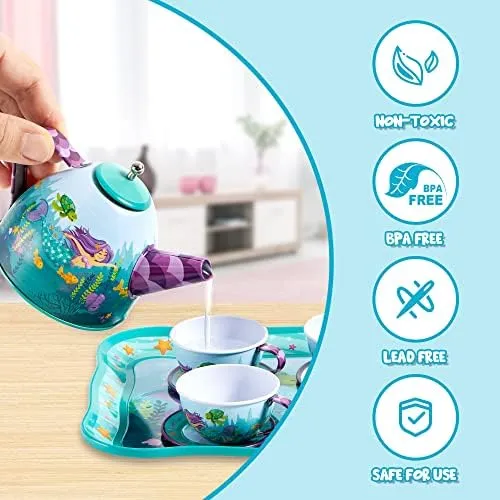 - ECHTE FUNKTION. Dieses bezaubernde Spielzeugset ist zum Vorspielen gedacht und regt Kinder dazu an, ihre Fantasie zu nutzen und ihre Kreativität und sozialen Fähigkeiten zu verbessern. Das Teeset ist mit einer zauberhaften Meerjungfrau, bunten Fischen und anderen entzückenden Meeresbewohnern verziert. Es wird Ihre kleinen Meerjungfrauen sicher begeistern und inspirieren.