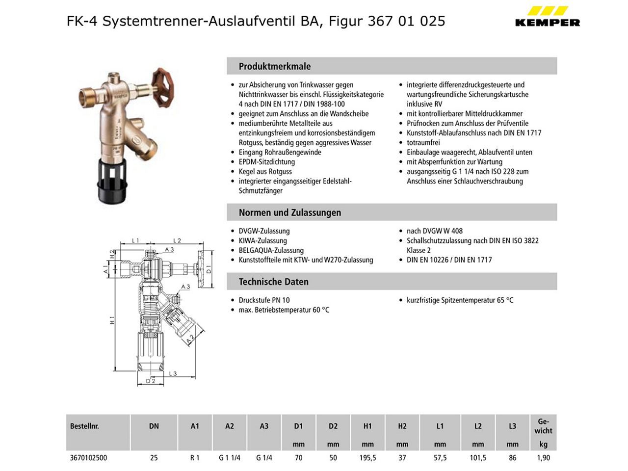 Kemper FK-4 Systemtrenner Auslaufventil BA DN 25 3670102500