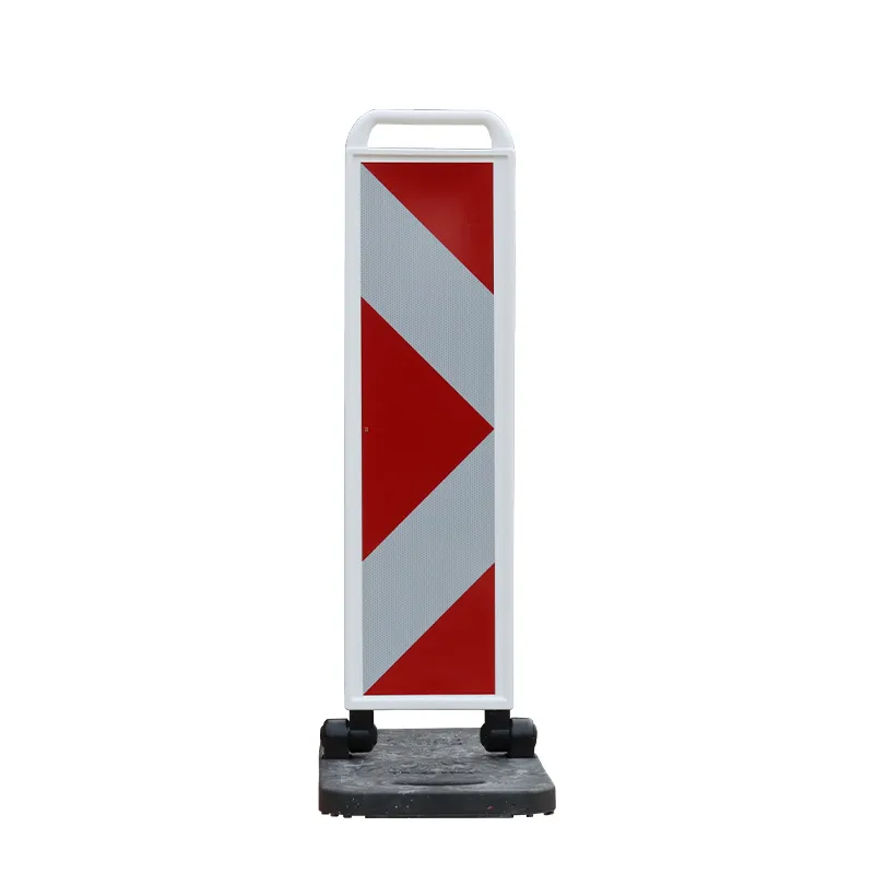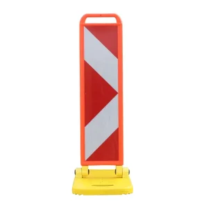 Die Klappbake Pfeilfolie RA2 horizont, Fuß schwarz, 2seitig rechts-/linksweisend ist optimal für den temporären Einsatz an Arbeits- und Gefahrstellen im Straßenverkehr geeignet.
