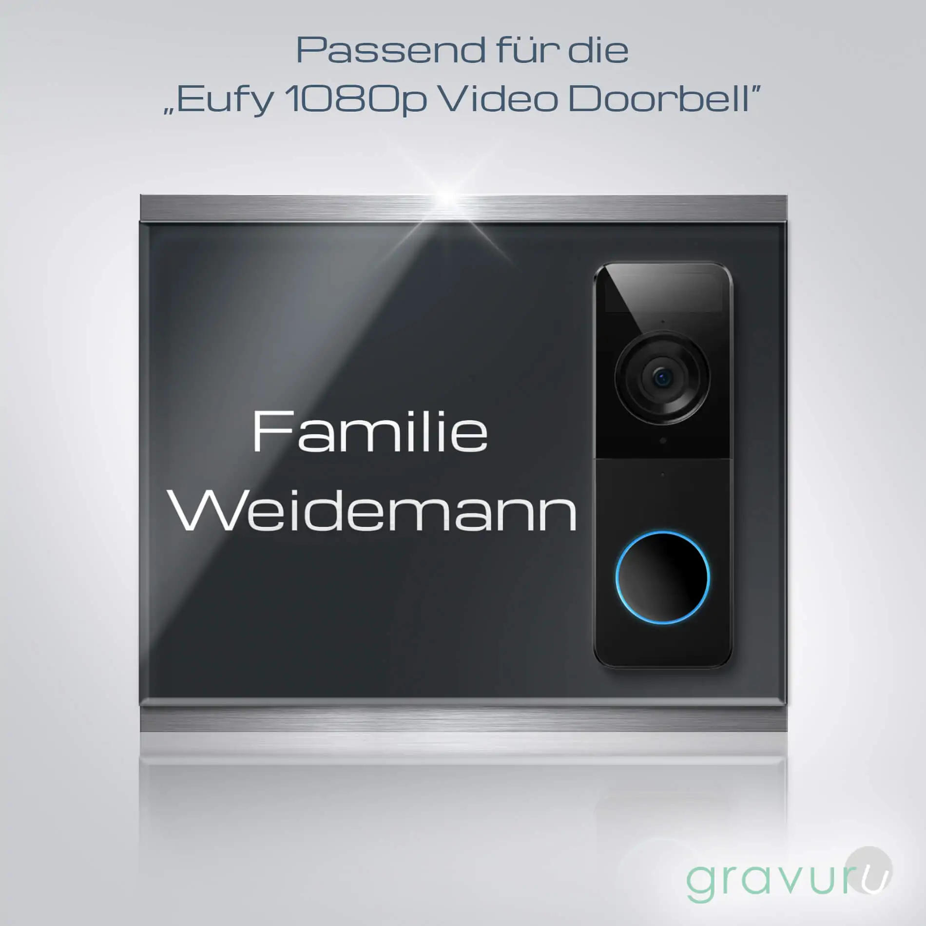 In unserem Konfigurator kannst Du das edle Haustürschild personalisieren. Als erstes kannst Du Dein Modell wählen, Eufy 1080P T8020 oder T8222. Bitte achte darauf, dass Du das richtige Modell auswählst, indem Du die Maße mit Deiner Klingel abgleichst. Suche danach den passenden Ausschnitt und eine Schriftart aus. Anschließend kannst Du Deinen Wunsch Text eingeben und optional eine Befestigung für das gesamte Hausschild auswählen.