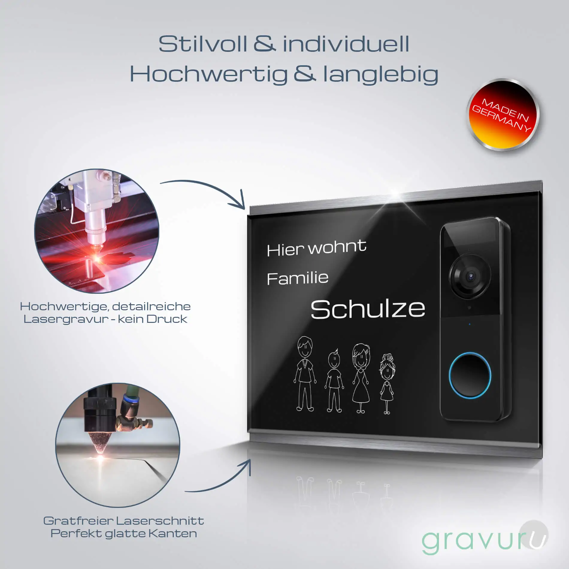 Die Funkklingelschilder aus Edelstahl & Acrylglas werden in unserer hauseigenen Produktionsstätte nach Industriestandard lasergeschnitten und graviert. Die Klingelplatte besticht nicht nur mit ihrer Optik, sondern auch mit ihrer Witterungsbeständigkeit – sie ist beständig, rostet nicht und trotzt Wind und Wetter.