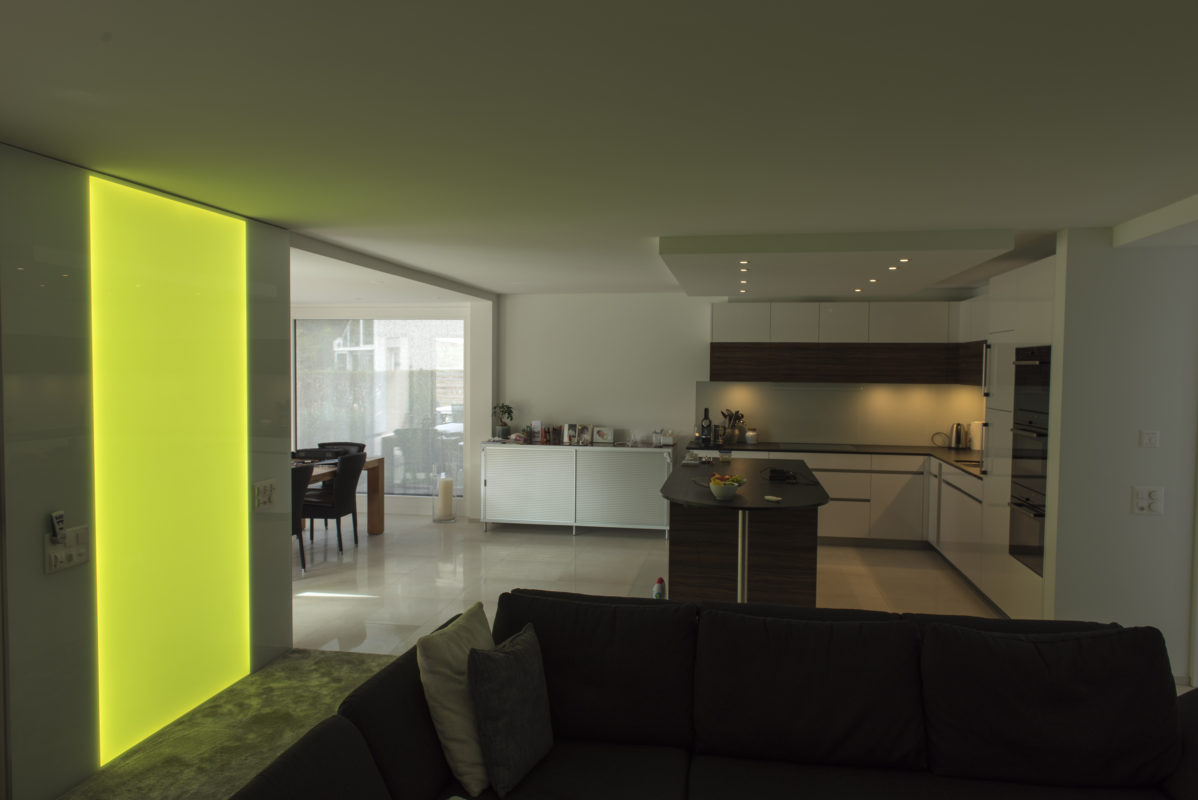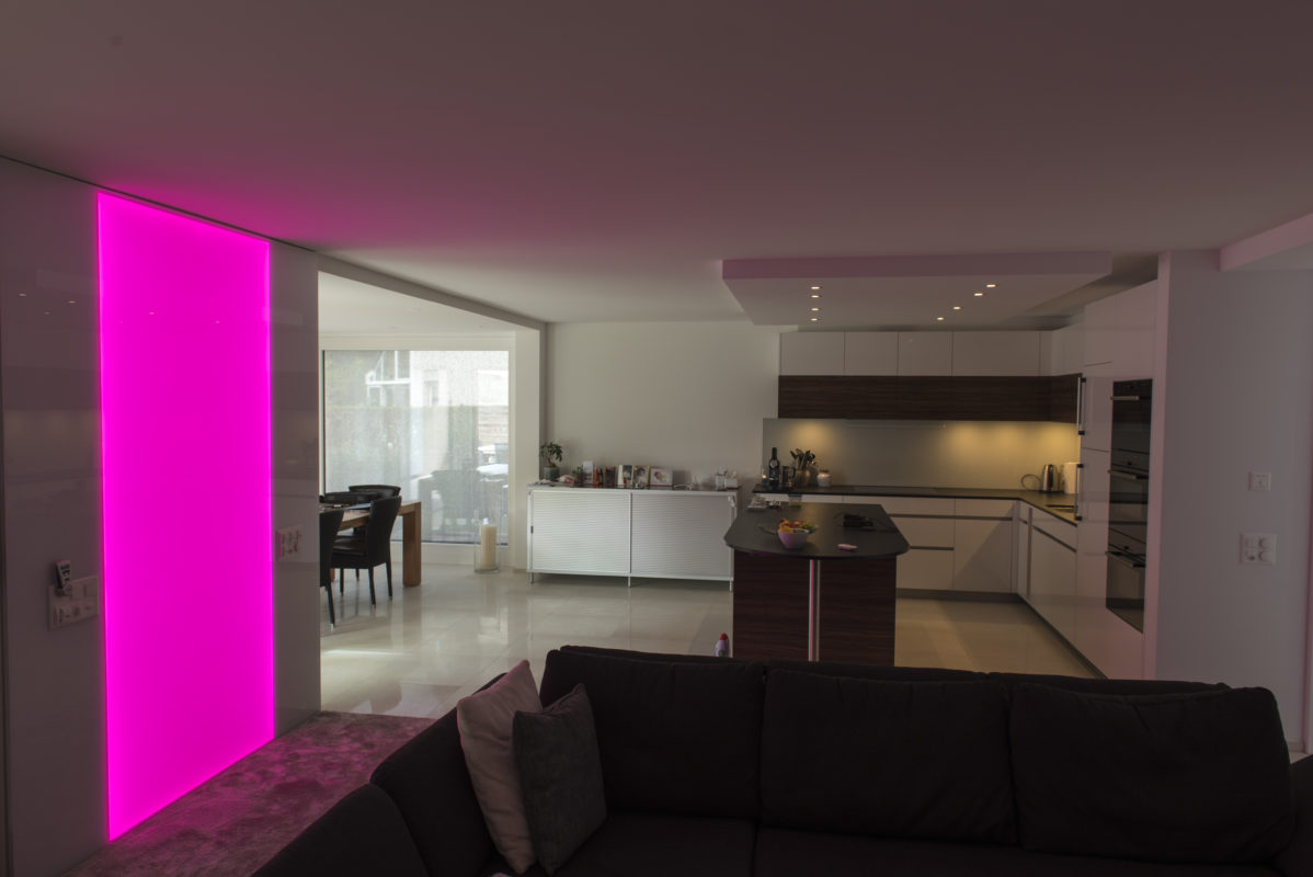 Die doppelseitig beleuchtete RGB Leuchtwand 200 x 100 cm wurde für Innen- und Aussenanwendungen oder als Duschtrennwand entwickelt.