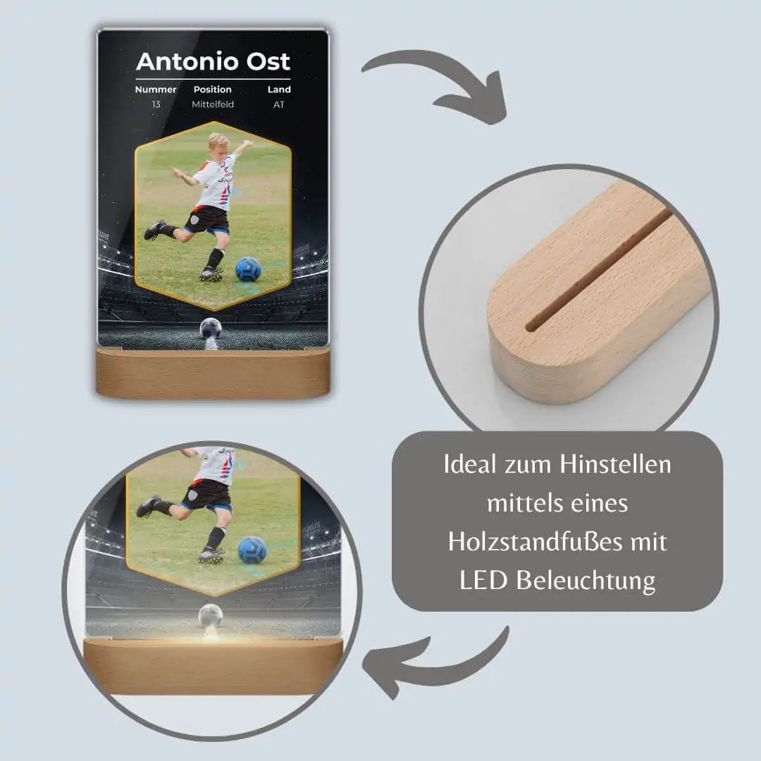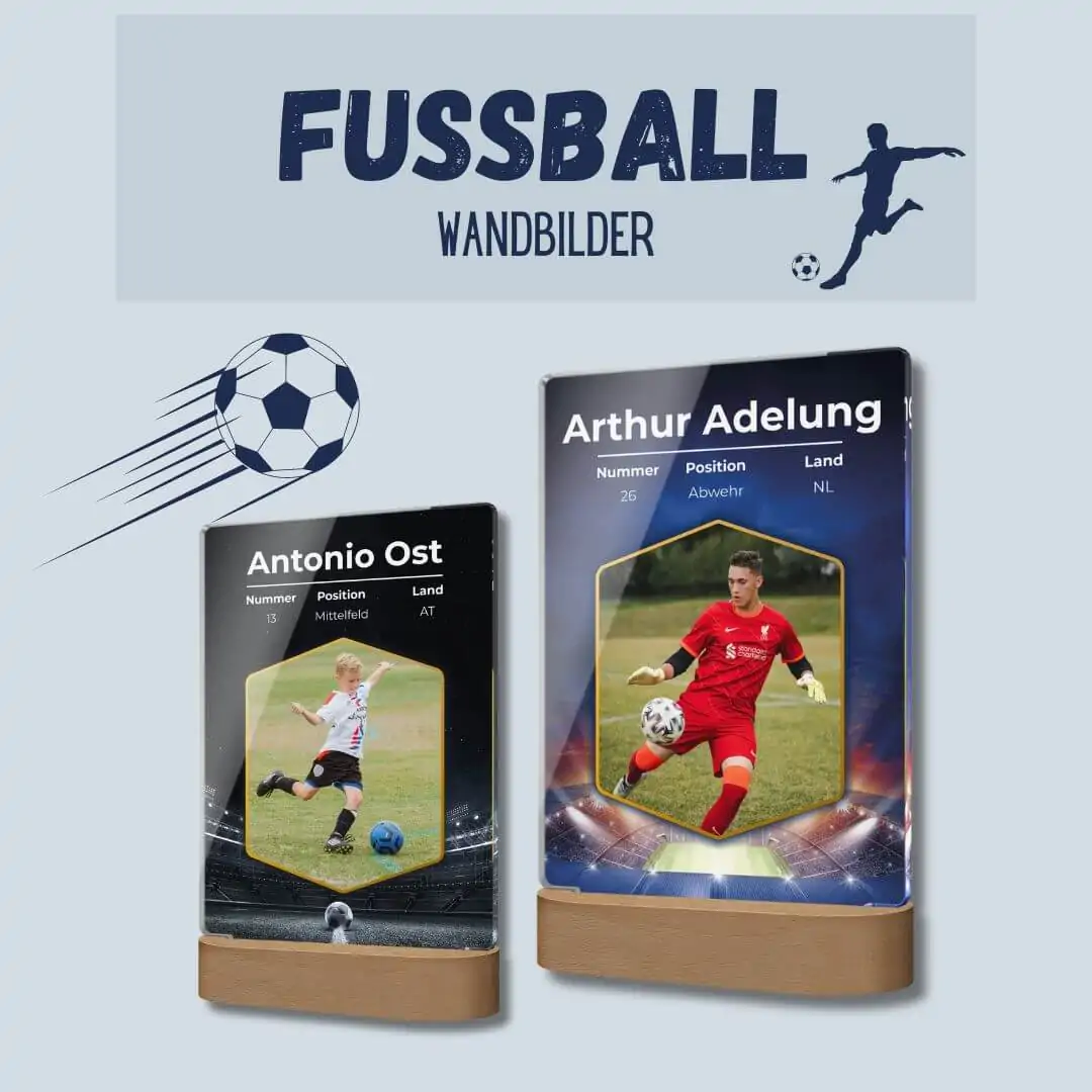 Fußball Standbild aus Hochglanz Acrylglas. Feiere die Fußballleidenschaft in deinem Leben mit unserem speziell zur EM kreierten Standbild, das jungen Talenten und leidenschaftlichen Spielern die einmalige Chance bietet, sich selbst im Rampenlicht zu sehen.