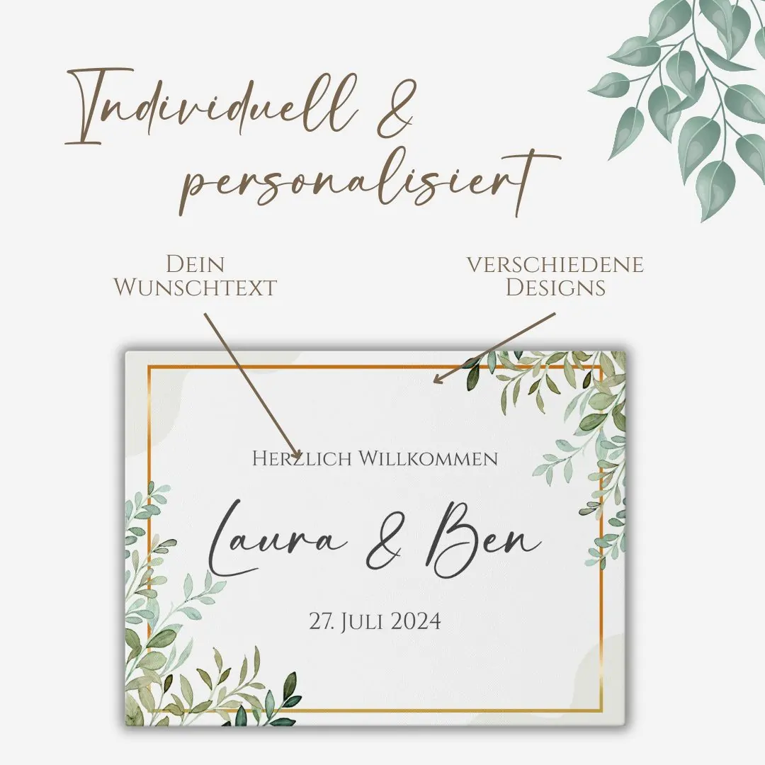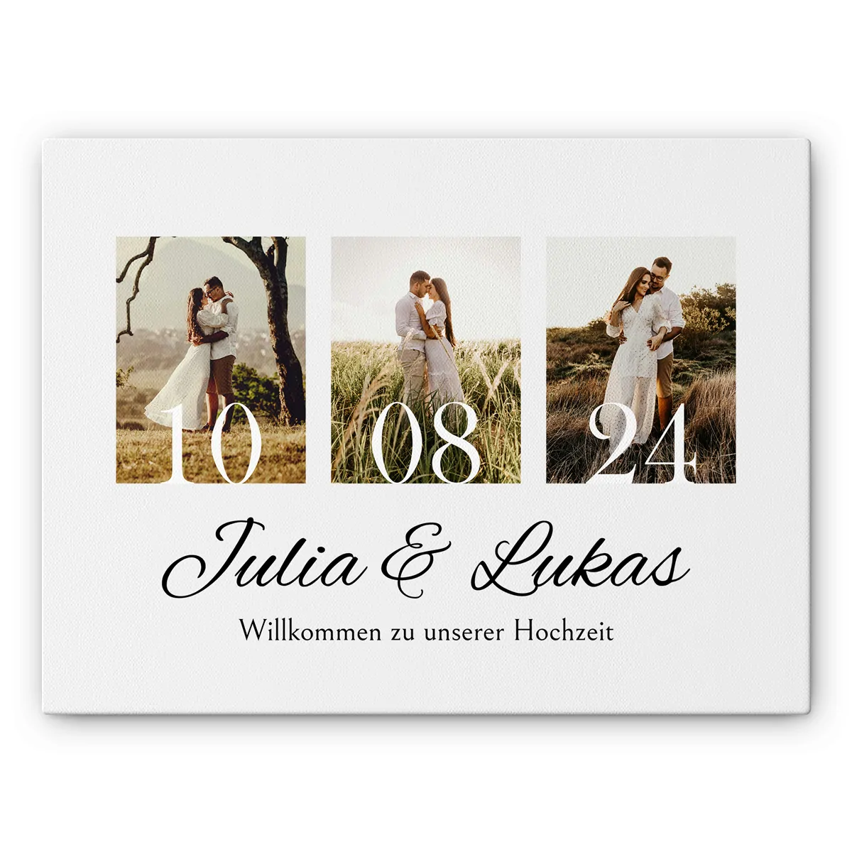 Verewige deinen schönsten Tag mit einem maßgeschneiderten Leinwand Wandbild, das speziell für deine Hochzeit gestaltet ist. Wähle eines unserer edlen Designs und füge deinen persönlichen Wunschtext hinzu, um ein wirklich einzigartiges Kunstwerk zu schaffen. Durch die weiße Leinwand wird der farbige UV-Druck spektakulär hervorgehoben, was die Lebendigkeit und Schärfe der Farben und Details verstärkt.