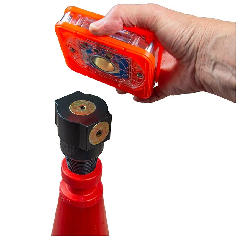 Der Leitkegeladapter besteht aus Kunststoff und hat 3 Magnete, an denen der StreetFlash schnell und einfach angebracht werden kann. An den beiden seitlichen Magneten kann je ein StreetFlash Blitzmodul vertikal befestigt werden. Am oberen Magnet kann ein Blitzmodul horizontal aufgelegt werden. So haben Sie die Möglichkeit, entweder die 16 Rundum-LED der Schnellabsicherungsleuchte oder die 4 LED auf der Oberseite einzusetzen.