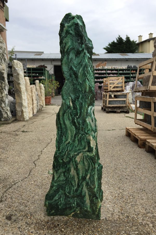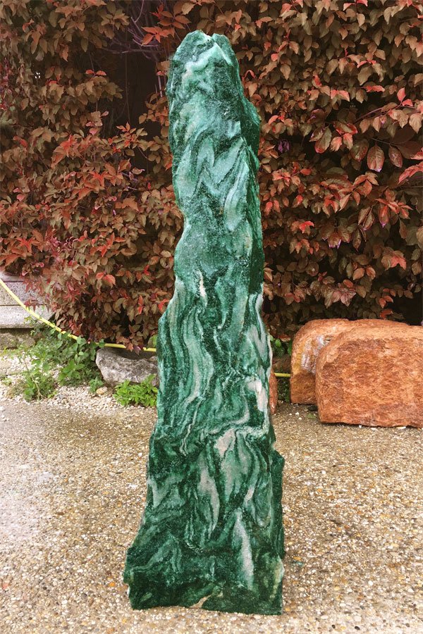 Herrlich gefärbter und geaderter Quarzit mit hohem Fuchsit-Anteil aus dem hohen Norden (Herkunft Norwegen – Oberhalb des Polarkreises !). Das satte tiefe Grün dieses Materials sucht seinesgleichen. Das Material ist 100% frostsicher!
