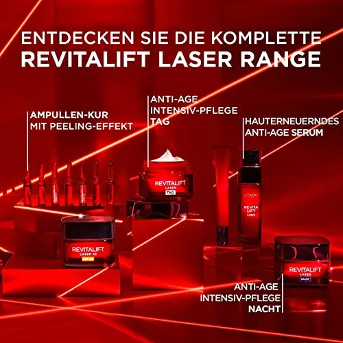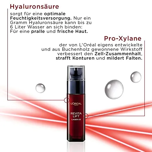 Das Anti-Aging-Serum Revitalift Laser X3 korrigiert Falten, verdichtet die Haut und modelliert das Gesicht neu. Sie ist angereichert mit Hyaluronsäure, um Falten präzise zu korrigieren, und Pro-Xylane, um Falten zu reduzieren, die Hautstruktur zu festigen und die Gesichtskonturen neu zu formen.