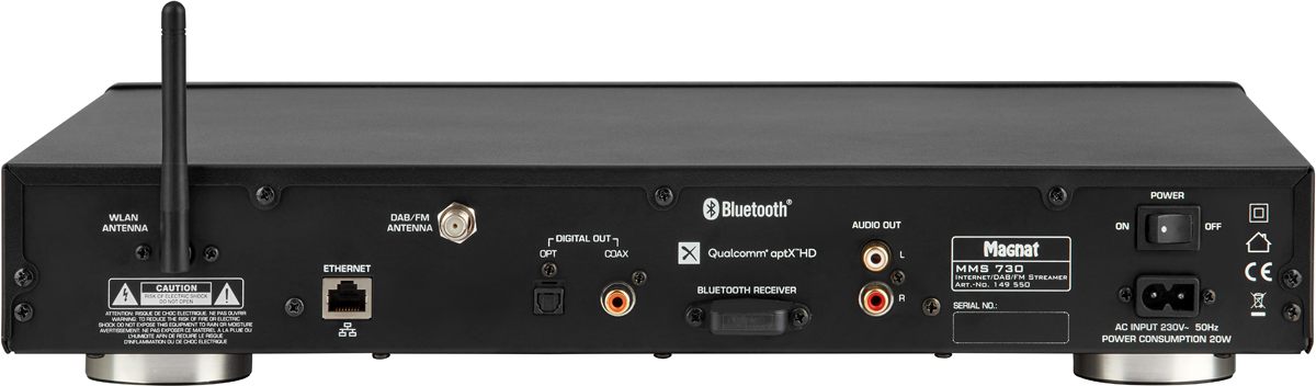 Mit seiner Gehäusebreite von 433 mm passt der MMS 730 perfekt zu Magnats anderen Hi-Fi-Komponenten, beispielsweise dem Röhren-Hybrid-Receiver MR 780 und dem CD-Spieler MCD 750. Dank seiner analogen und digitalen (optisch und koaxial) Ausgänge lässt sich der MMS mit vorhandener Elektronik jeglicher Art kombinieren und erweitert diese um die vielfältigen Möglichkeiten neuer Medien. Selbst ein älterer Röhrenverstärker wird so zum Multimedia-Talent.