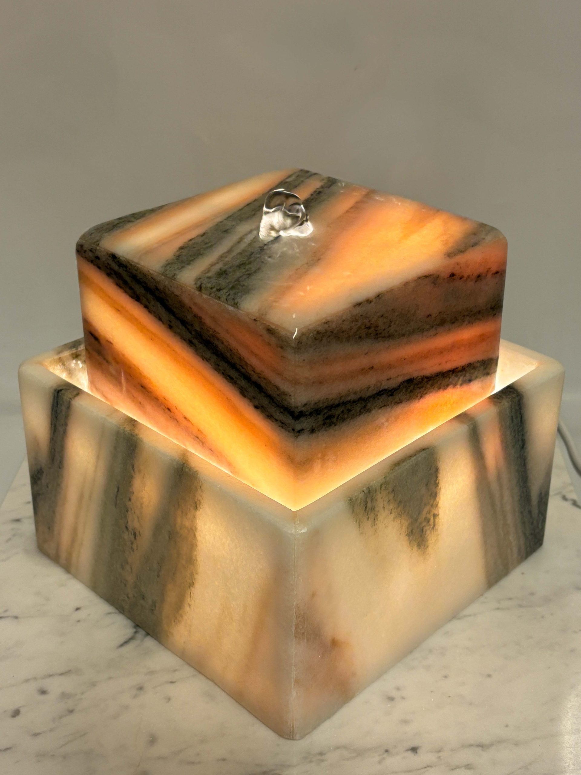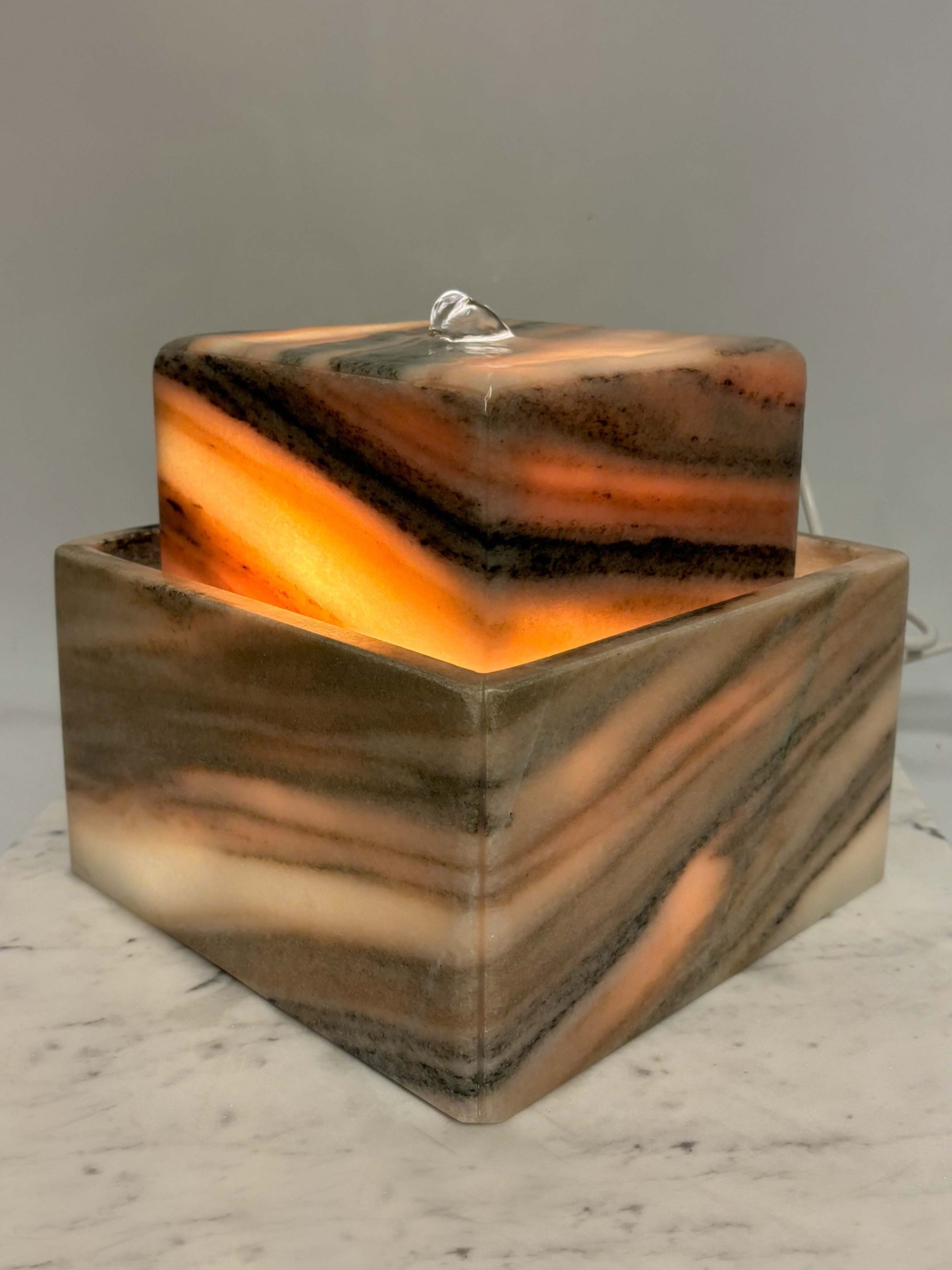 Der hohle Quellkörper wird auf eine in der Wanne befestigten Unterbaukonstruktion aus Acrylglas positioniert. In der Wanne befindet sich die Qualitätspumpe, welche das Wasser immer wieder über das Oberteil befördert. Das bei der Pumpe integrierte & zuschaltbare Halogenlicht beleuchtet den kompletten Marmorbrunnen.
