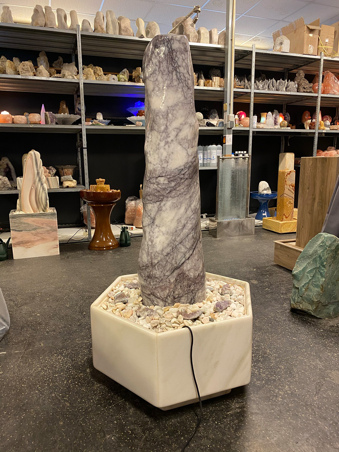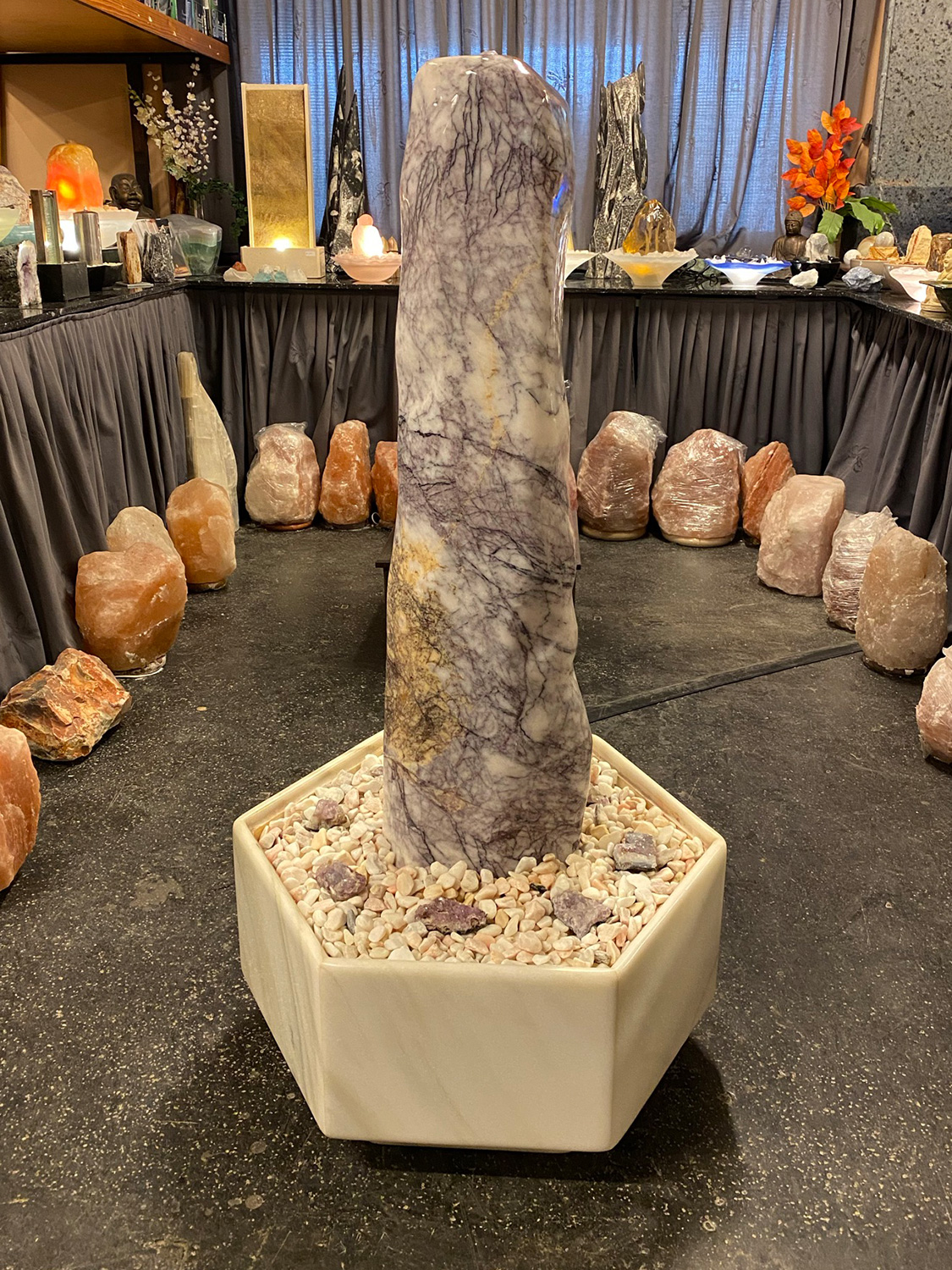 Der Basistisch ist mit einem getrommelten Zierkiesel aus “Sölker-Marmor” abgedeckt. Zusätzlich wurden noch einige echte Amethyst-Stücke platziert, welche farblich perfekt mit dem lila Farbton des Marmor-Quellsteins harmonieren.