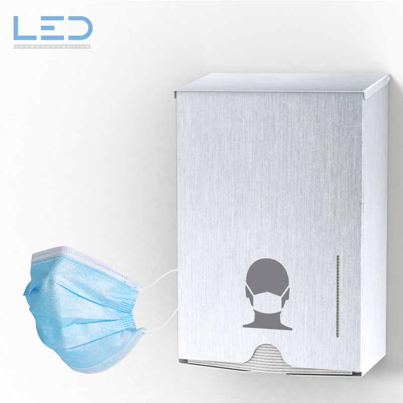 Die Masken werden lose oben eingelegt und können unten am oberen Maskenrand am Nasenbügel entnommen werden. Je nach Maskentyp passen bis zu 250 Masken in den Spender.