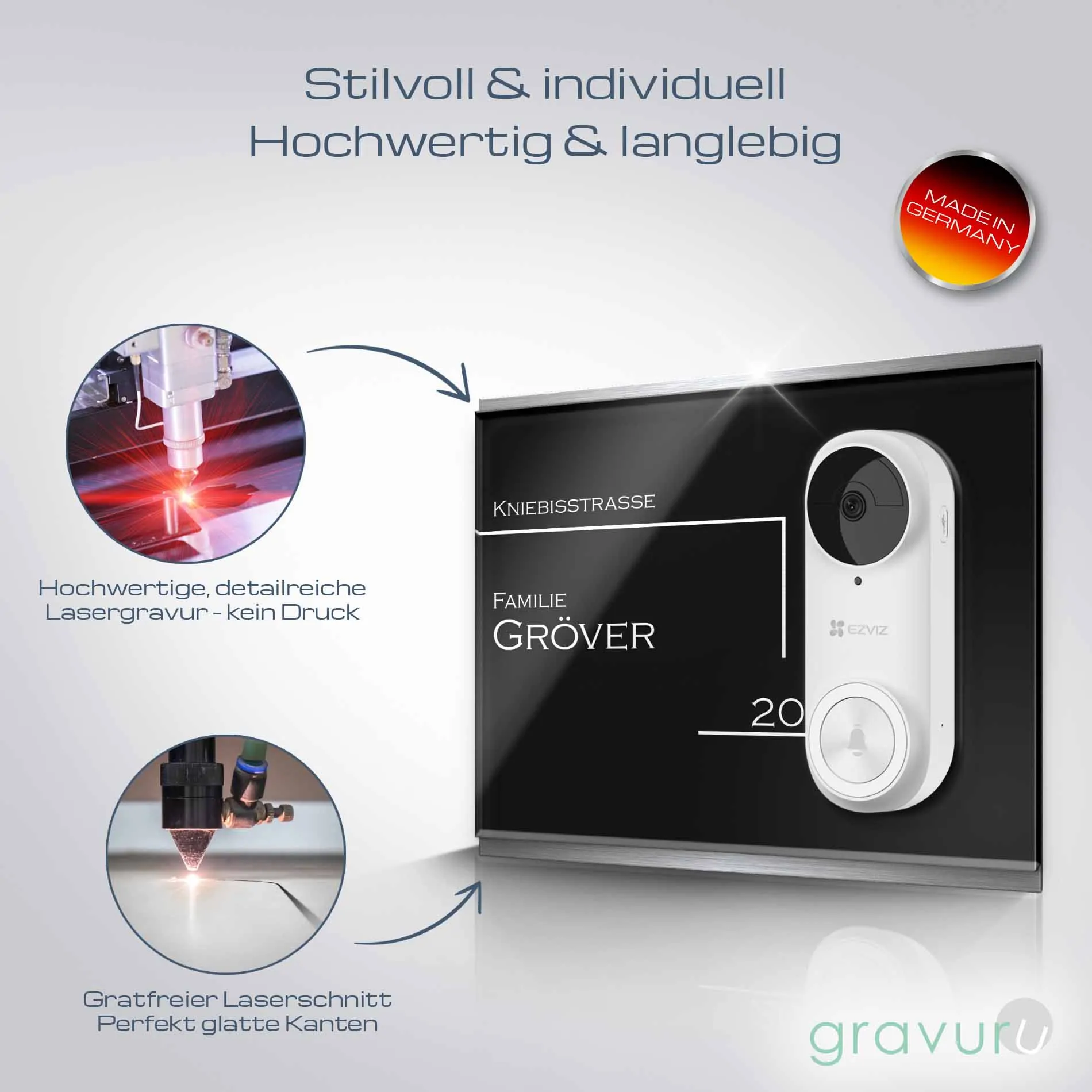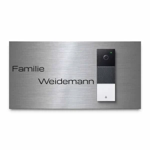 Die Funkklingelschilder aus Edelstahl & Acrylglas werden in unserer hauseigenen Produktionsstätte nach Industriestandard lasergeschnitten und graviert. Die Klingelplatte besticht nicht nur mit ihrer Optik, sondern auch mit ihrer Witterungsbeständigkeit – sie ist beständig, rostet nicht und trotzt Wind und Wetter.