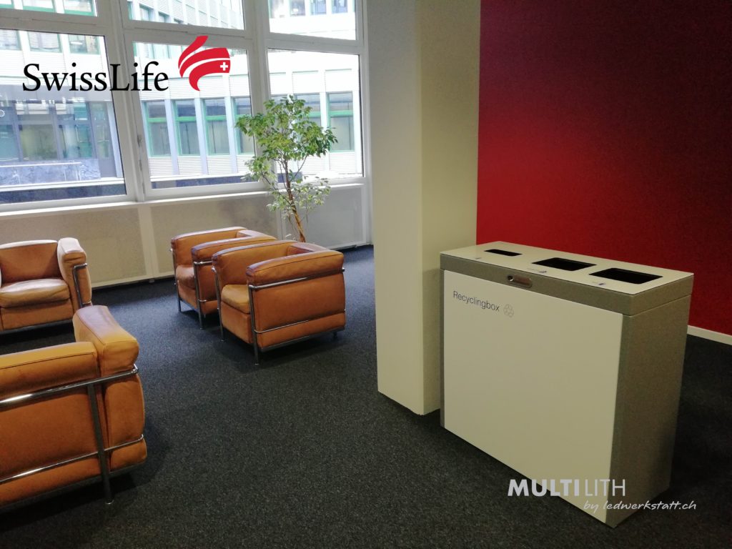 Der Multilith 3.0 Abfallbehälter passt perfekt in Büros und Empfangsbereiche, um Abfalltrennung stilvoll umzusetzen. Er ist ebenfalls geeignet für überdeckte Aussenbereiche.