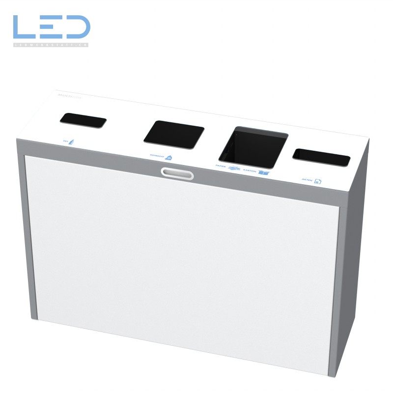 - Variabel kombinierbarer Wertstoffbehälter (Fraktionen frei wählbar: PET / Alu / Papier / Karton / Ascher / Restmüll)