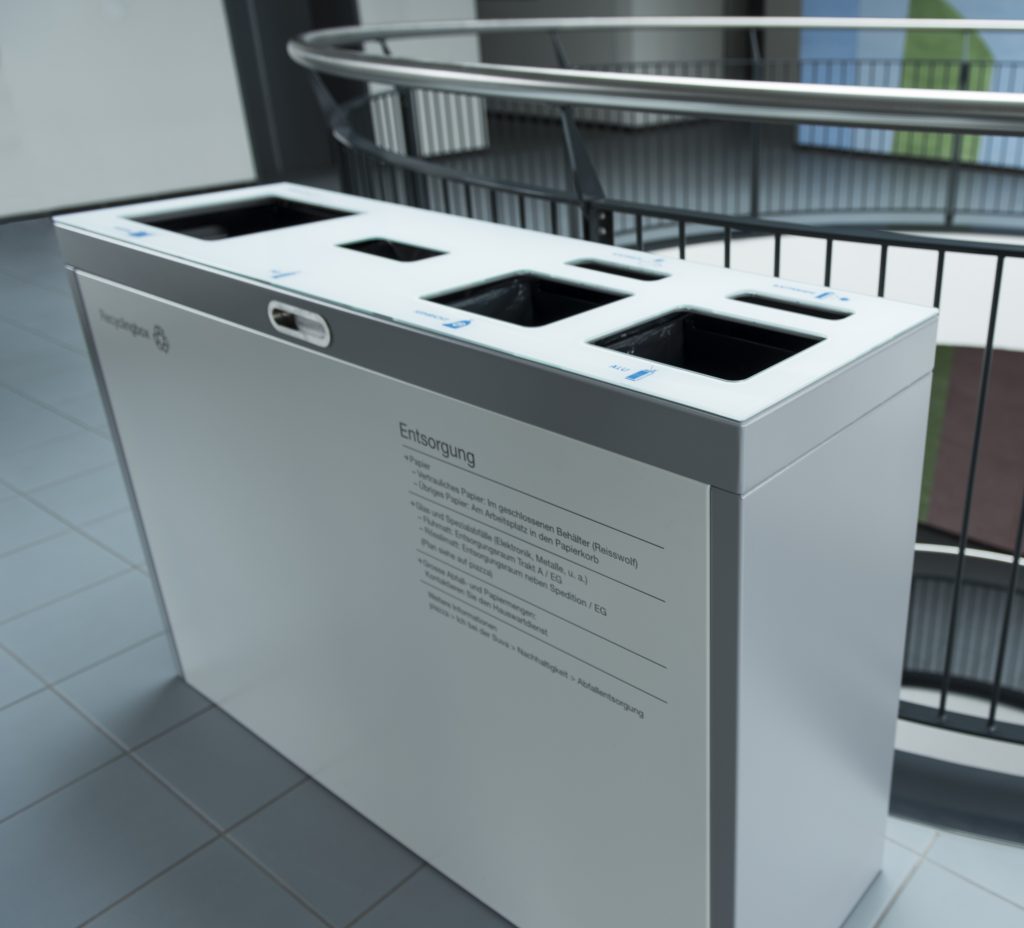 Die Multilith Recyclingstation passt perfekt in Büros und Empfangsbereiche, um Abfalltrennung stilvoll umzusetzen. Er ist ebenfalls geeignet für überdeckte Aussenbereiche.