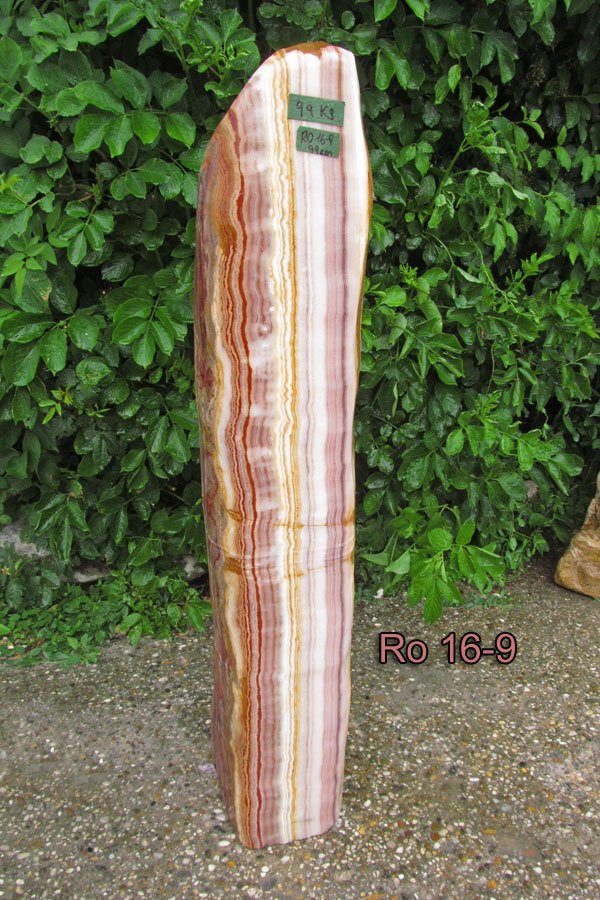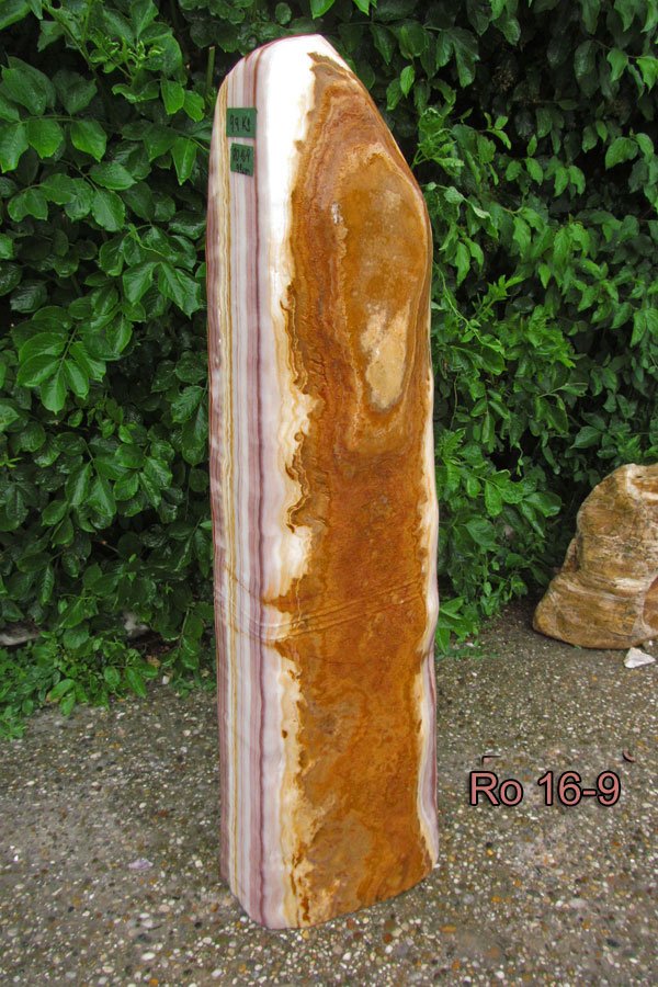 Dieser, komplett geschliffene, gestreifte Onyx besticht durch seine feine Zeichnung und durch sein wunderbares Farbenspiel. Dieser Stein wird ein herrlicher Blickfang in Ihrem Garten sein. Das Material ist 100%ig frostsicher.