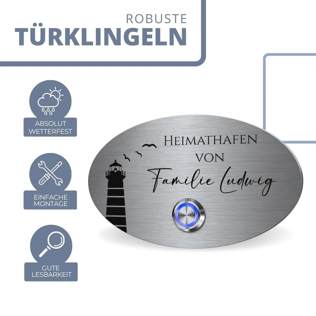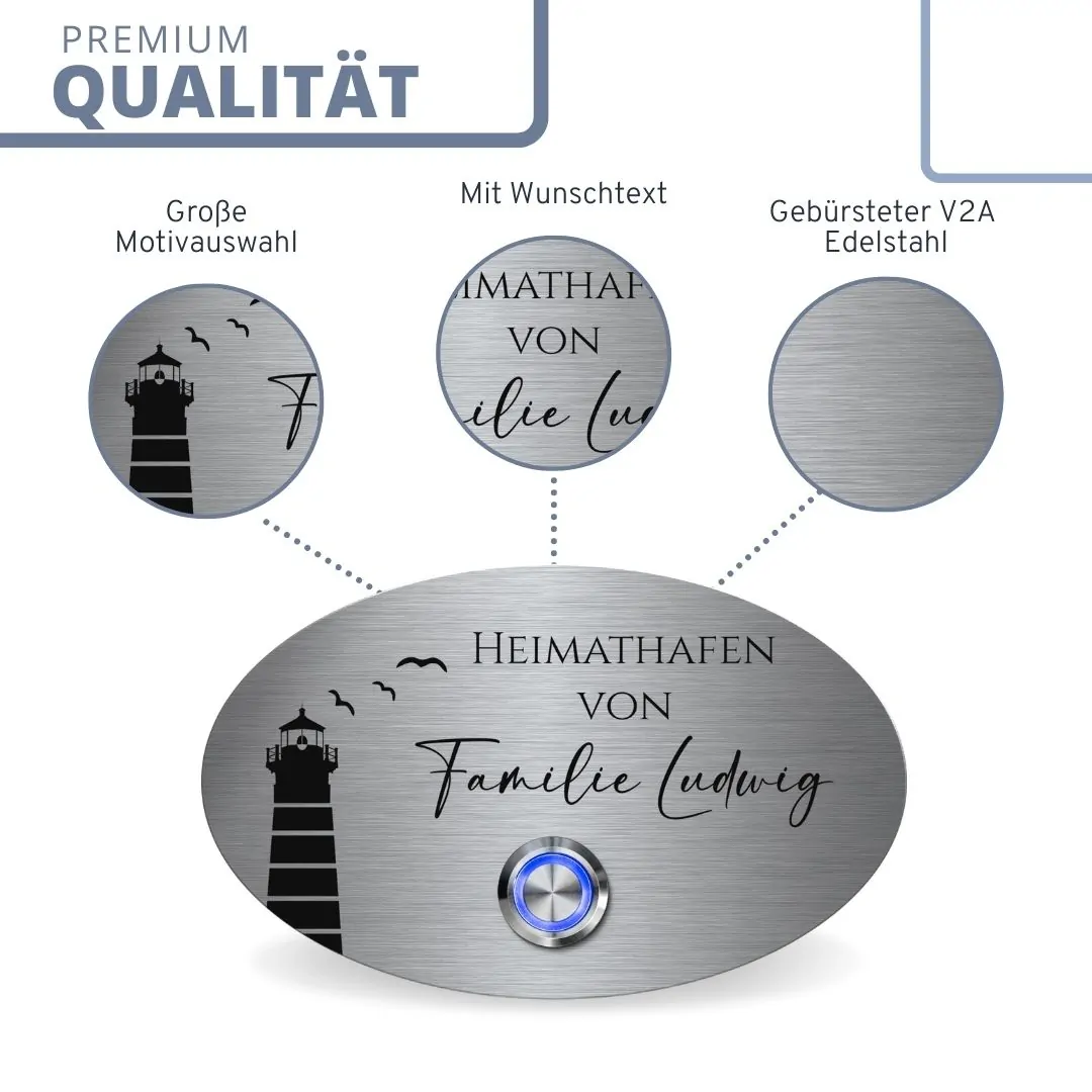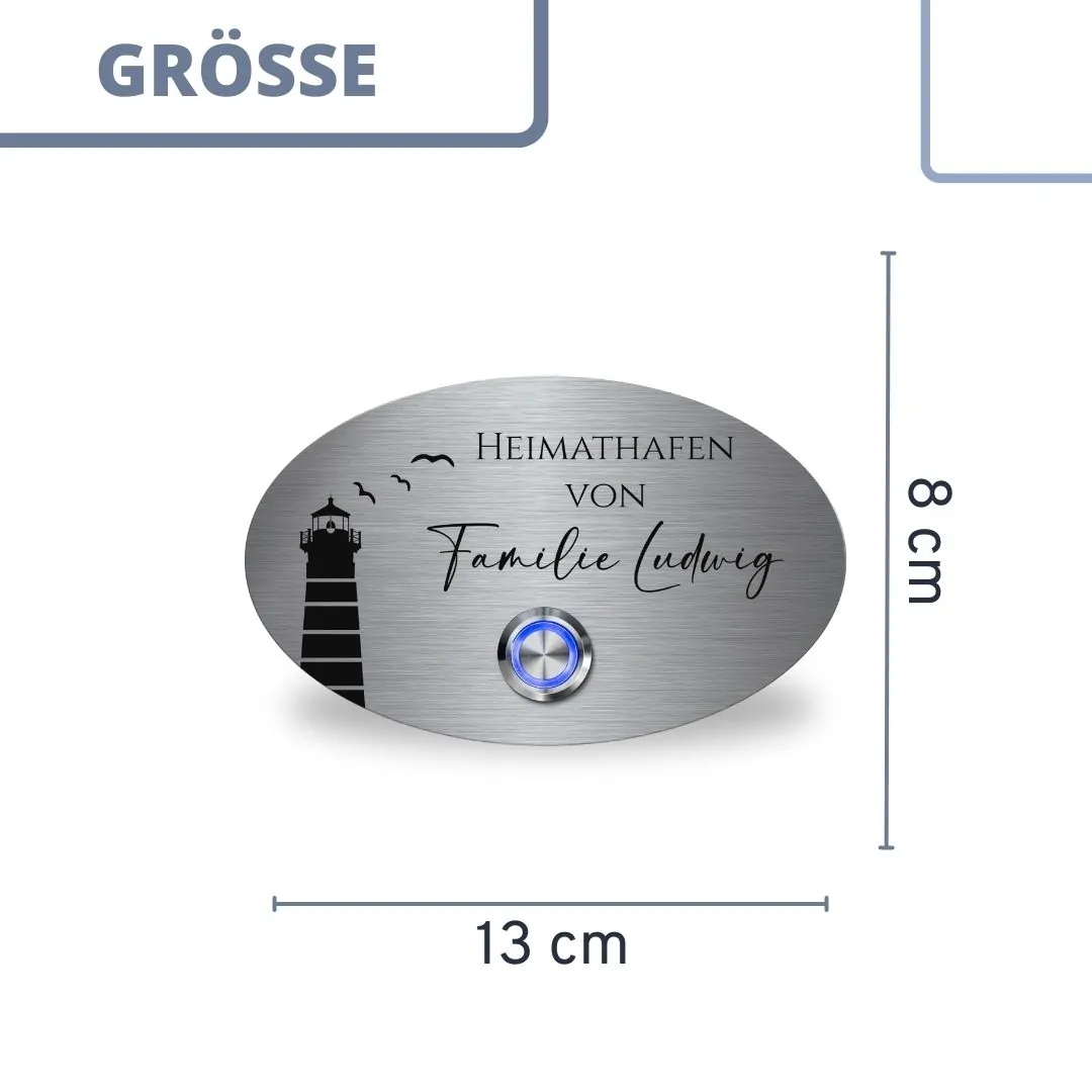 Ovale Klingel aus Edelstahl mit Gravur und LED-Taster 13×8 cm