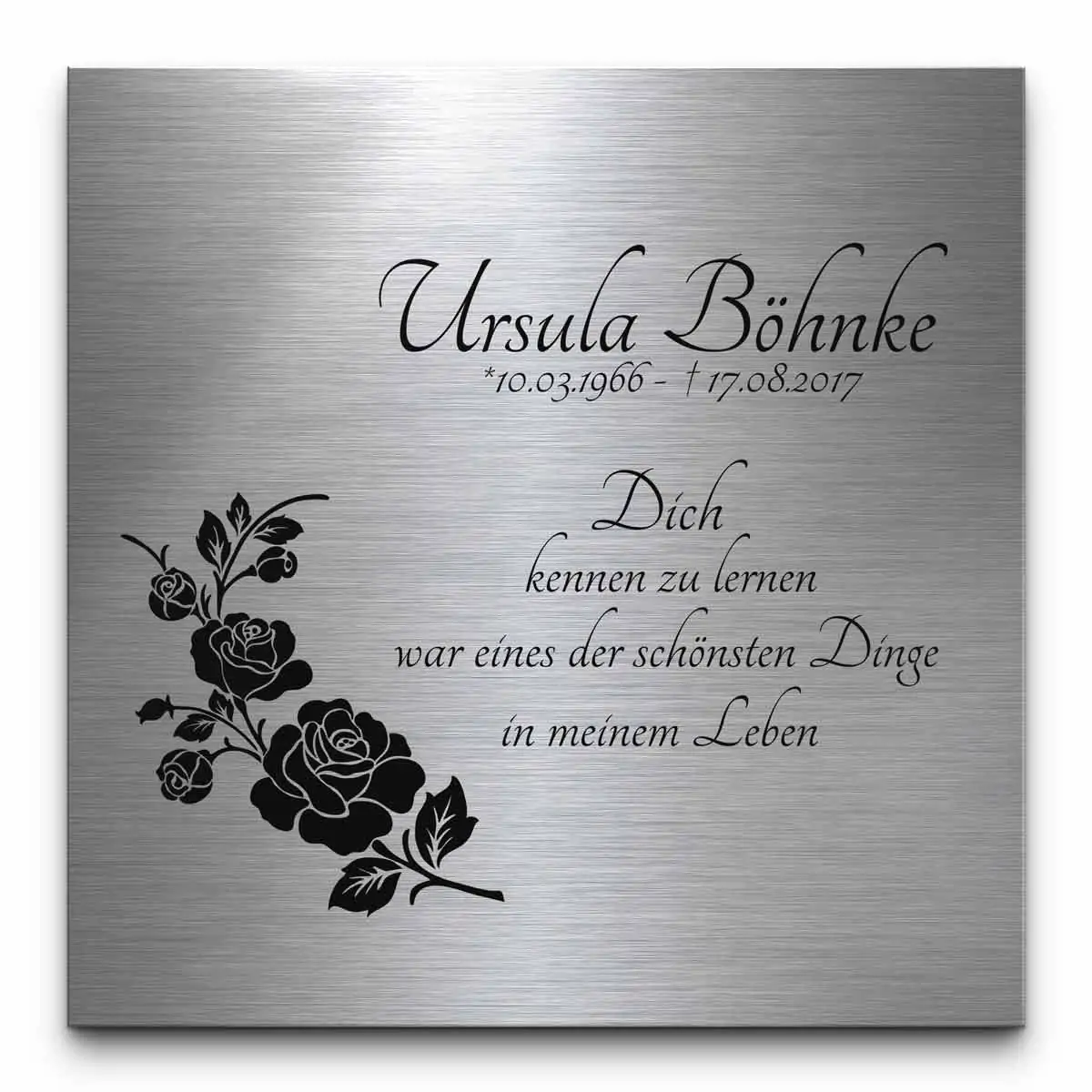 Unsere Grabsteine aus Edelstahl schaffen ein liebevolles Erinnerungsstück, welches nicht nur als Grabplatte für ein Urnengrab, sondern auch als Liegeplatte für ein Wiesengrab oder als Andenken für das heimische Wohnzimmer dienen kann. Wir gravieren Dir eine Gedenkplatte mit individueller Widmung und passenden Motiven.