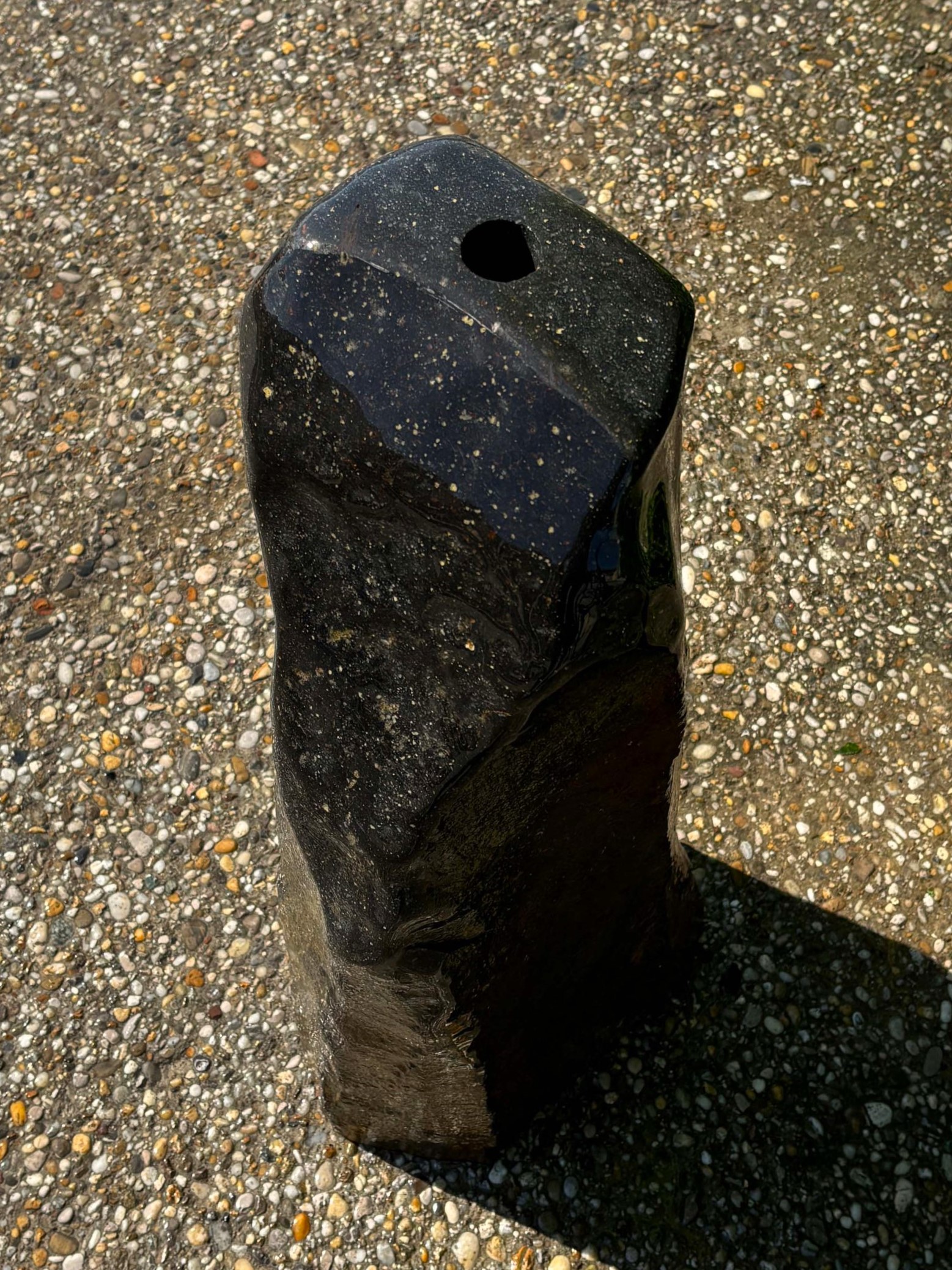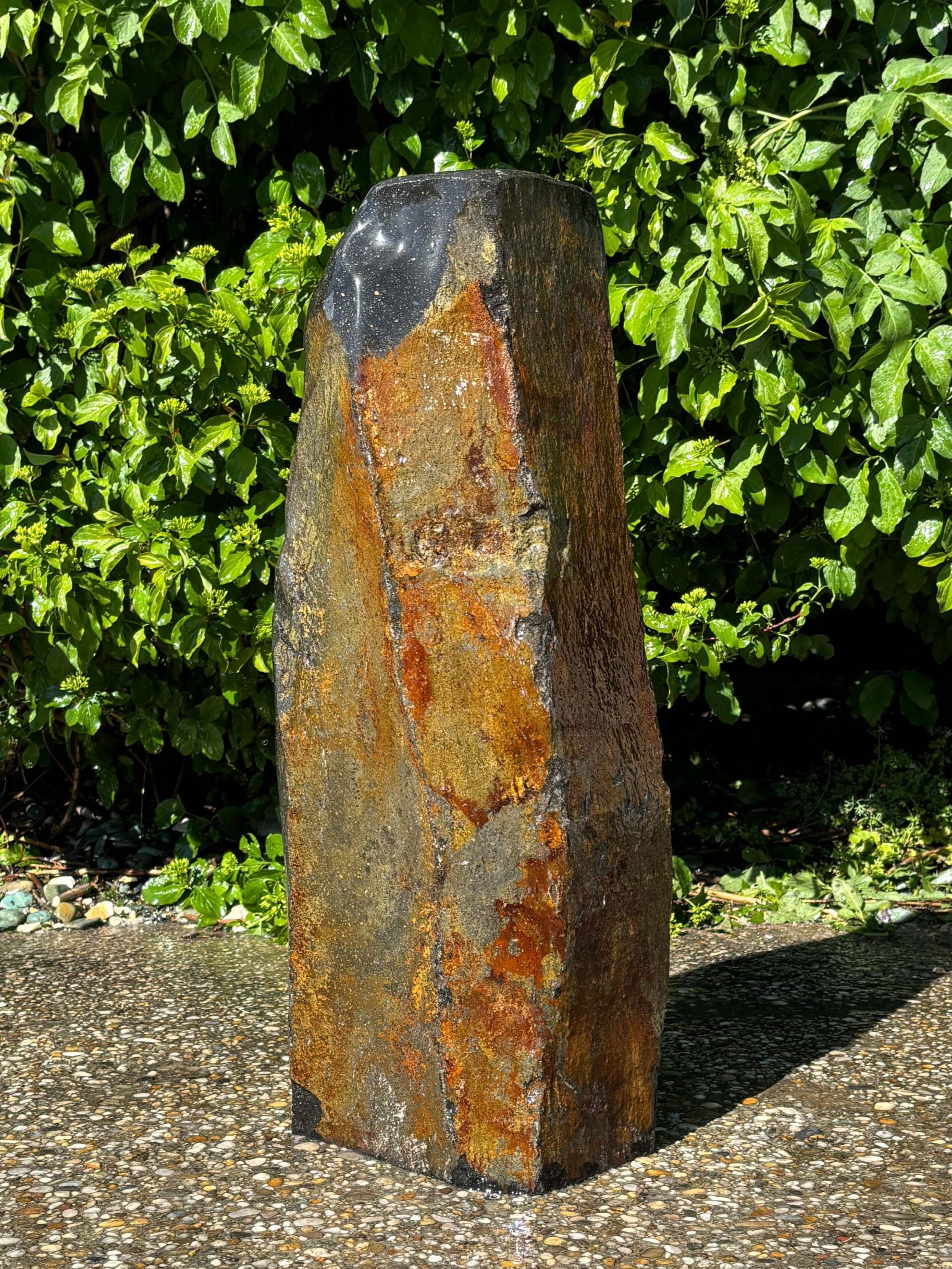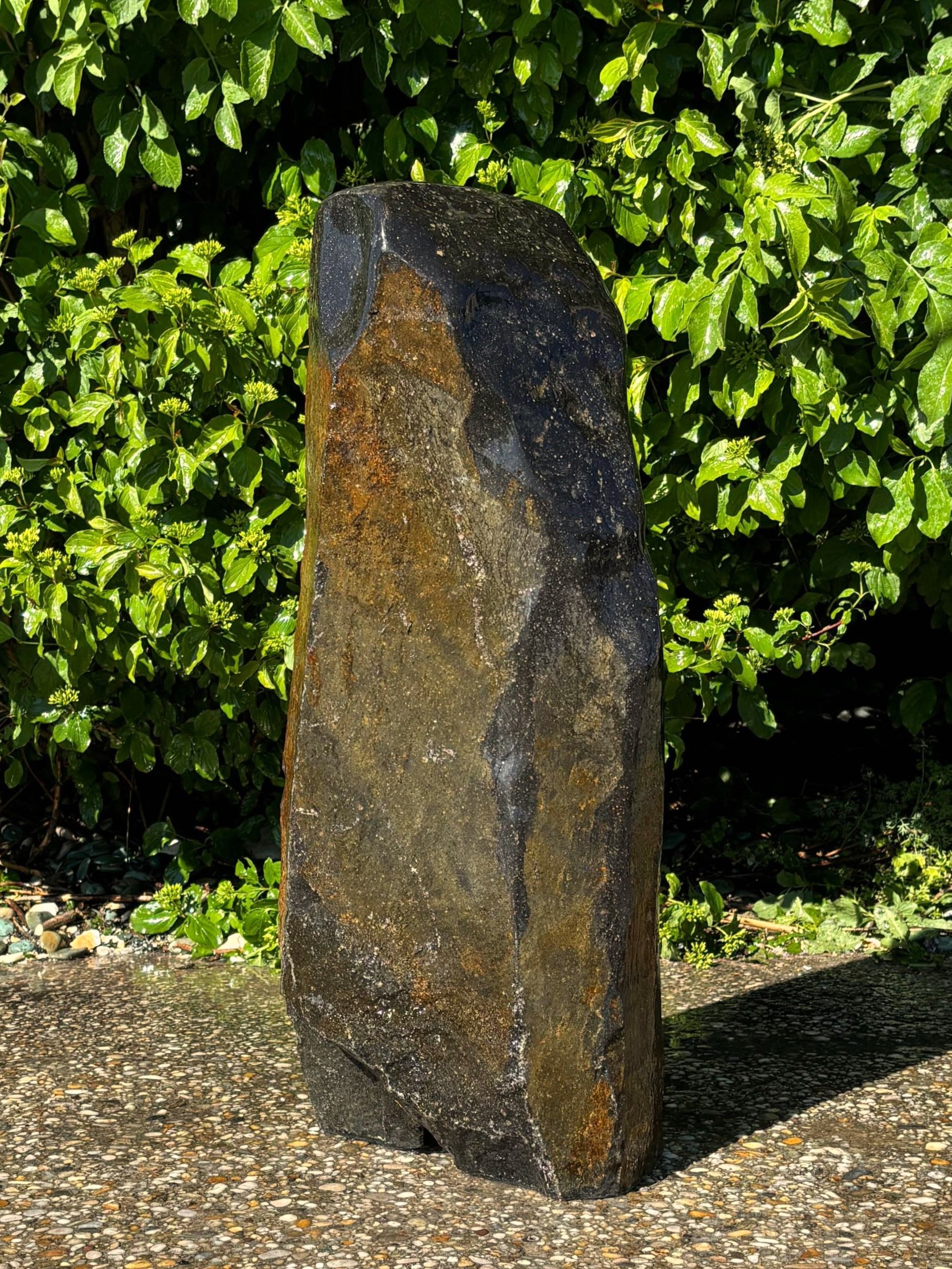 Dieser schwarze Basalt mit teilweise naturbelassen bräunlichen Flächen ist ein echter Blickfang und fügt sich perfekt in jedes Ambiente ein.