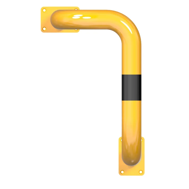 Die einseitig vertieften Rammschutzbügel 90° bestehen aus stabilem Stahlrohr mit 76 mm Durchmesser. Die gelbe Farbbeschichtung in RAL 1003 (Abbildung ähnlich) und die schwarzen Warnstreifen bieten zusätzlich Sicherheit und eine optimale Wahrnehmung der Schutzelemente.