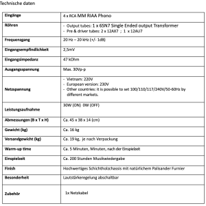 Durch die Verwendung von hochohmigen FET-s wird vermieden, dass ein Offsetstrom am Eingang die Funktion des Abtasters beeinflussen kann. Die Anpassung des Tonabnehmers kann per Mikroschalter auf der Rückseite des Gerätes zwischen 70 und 400 Ohm sowie kapazitiv zwischen 1000 und 4200 pF geschaltet werden. Die Empfindlichkeit kann bei Bedarf um 6dB angehoben werden.