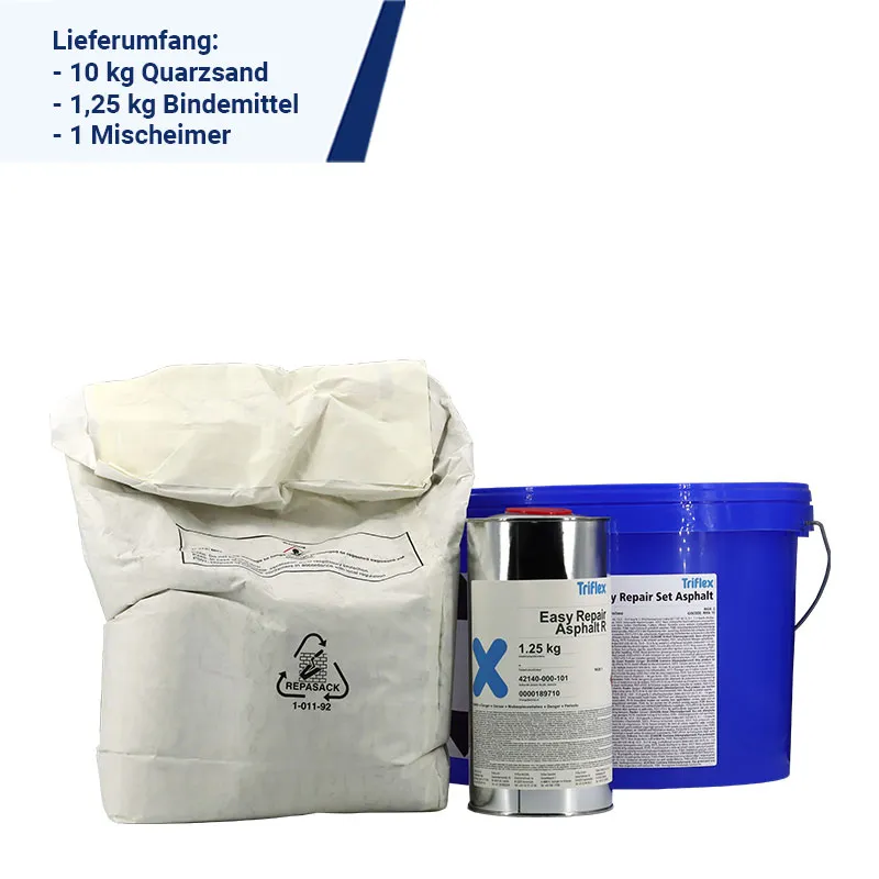 Der Lieferumfang besteht aus 10 kg Quarzsand, 1,25 kg Bindemittel sowie einem robusten Eimer. In diesem werden der Sand und das Bindemittel zusammengeschüttet und mit einem Rührwerkzeug durchgemischt. Danach kann die Mischung direkt aufgetragen werden. Bei einer Schichtstärke von 6 mm liegt der Verbrauch bei 9 kg pro Quadratmeter.
